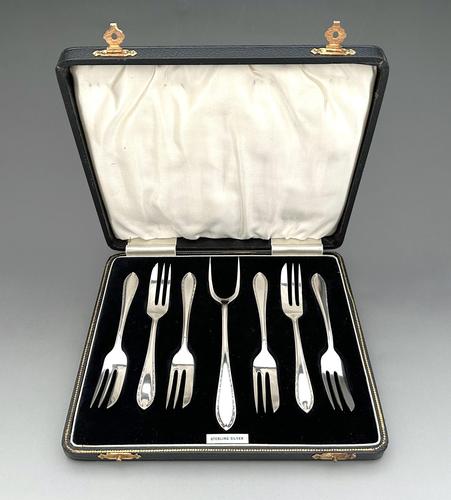 An Excellent Boxed Set of Six Silver Cake Forks & Serving Fork