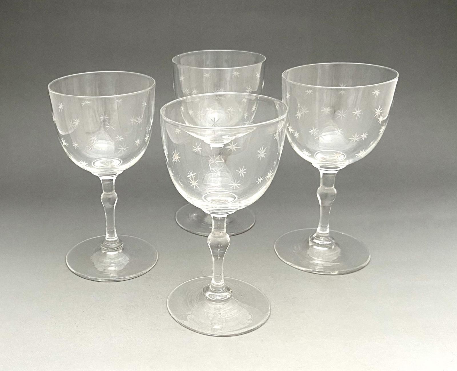 A delightful set of four dessert wine glasses with star etched pattern to the bowls. These lovely examples date from the late Victorian era. The bowls are supported with collars and the elegant stems have inverted baluster knops. To the bases are polished pontil marks. These lovely examples are as practical as they are decorative.