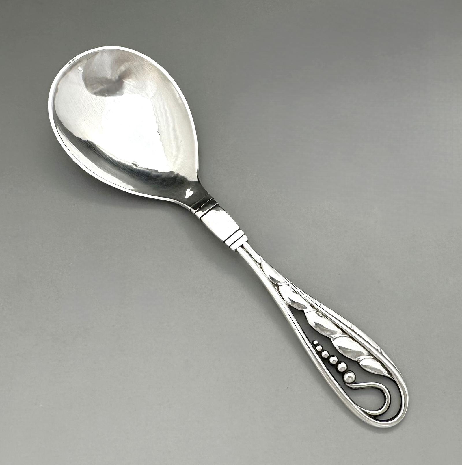 A stunning silver spoon by the renowned Georg Jensen. This stylish piece is design number 42 and was designed by Jensen himself. The spoon features a beautifully cast, gently planished bowl and terminal. The graceful looped handle is embellished with elegant, stylized leaf and bud motifs, showcasing Jensen's signature blend of artistry and craftsmanship. This wonderful piece is of good gauge silver and would serve well as a preserve spoon.