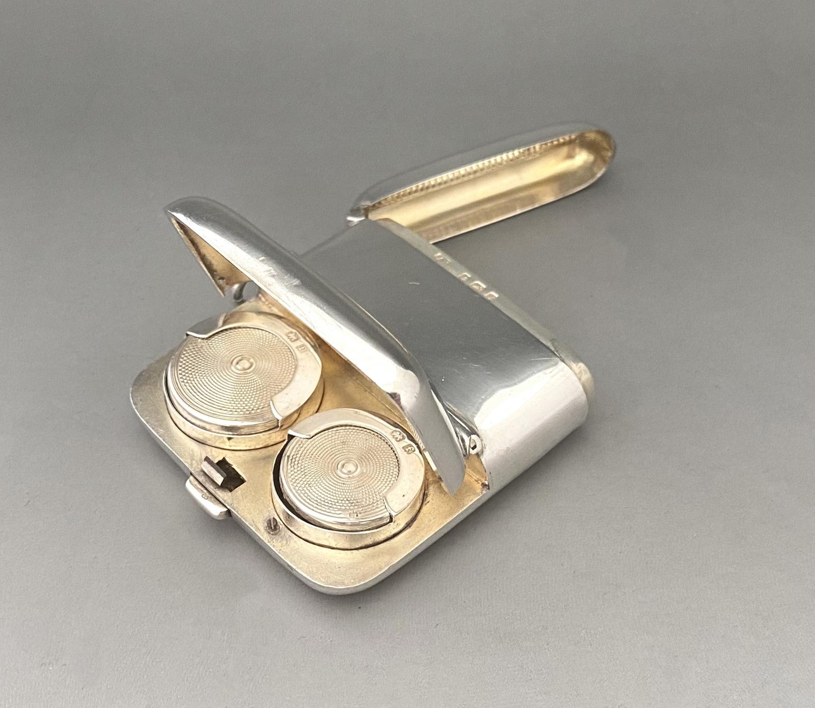 A delightful and interesting item of Edwardian silver. This rare piece is a vesta with a combined double sovereign holder. This lovely example has a stylish plain body with a striker to the vesta lid. The vesta lid is hinged and the interior is fully gilded. The sovereign holder also has a hinged lid, opening to reveal a matching fully gilded interior and the sprung loaded compartments for a sovereign and half sovereign. To the side is an attaching loop for a fob chain. A fine collector's item.