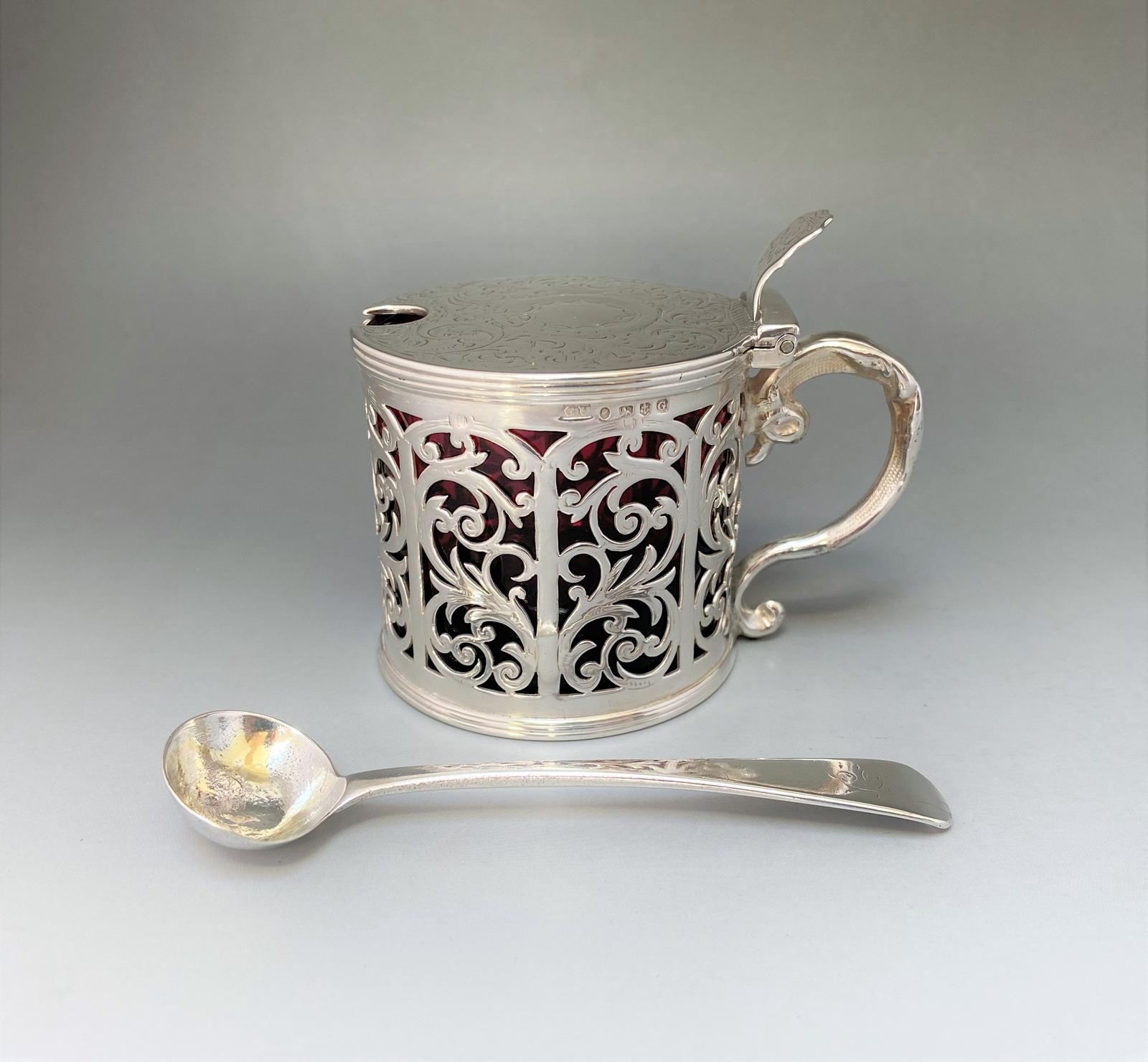 A superb and attractive silver mustard pot and spoon from the early Victorian period. This gorgeous and collectable example is of drum form with acanthus themed piercing to the sides of the body. The scroll handle follows this theme and to the front there is a vacant cartouche. The hinged lid is extensively engraved repeating the decoration of the body and has a vacant cartouche to the middle. The thumb grip is shaped and engraved with flowers. The pot is fitted with a wonderful cranberry glass liner and comes with an associated silver spoon. A wonderful collector's item, both usable and decorative.