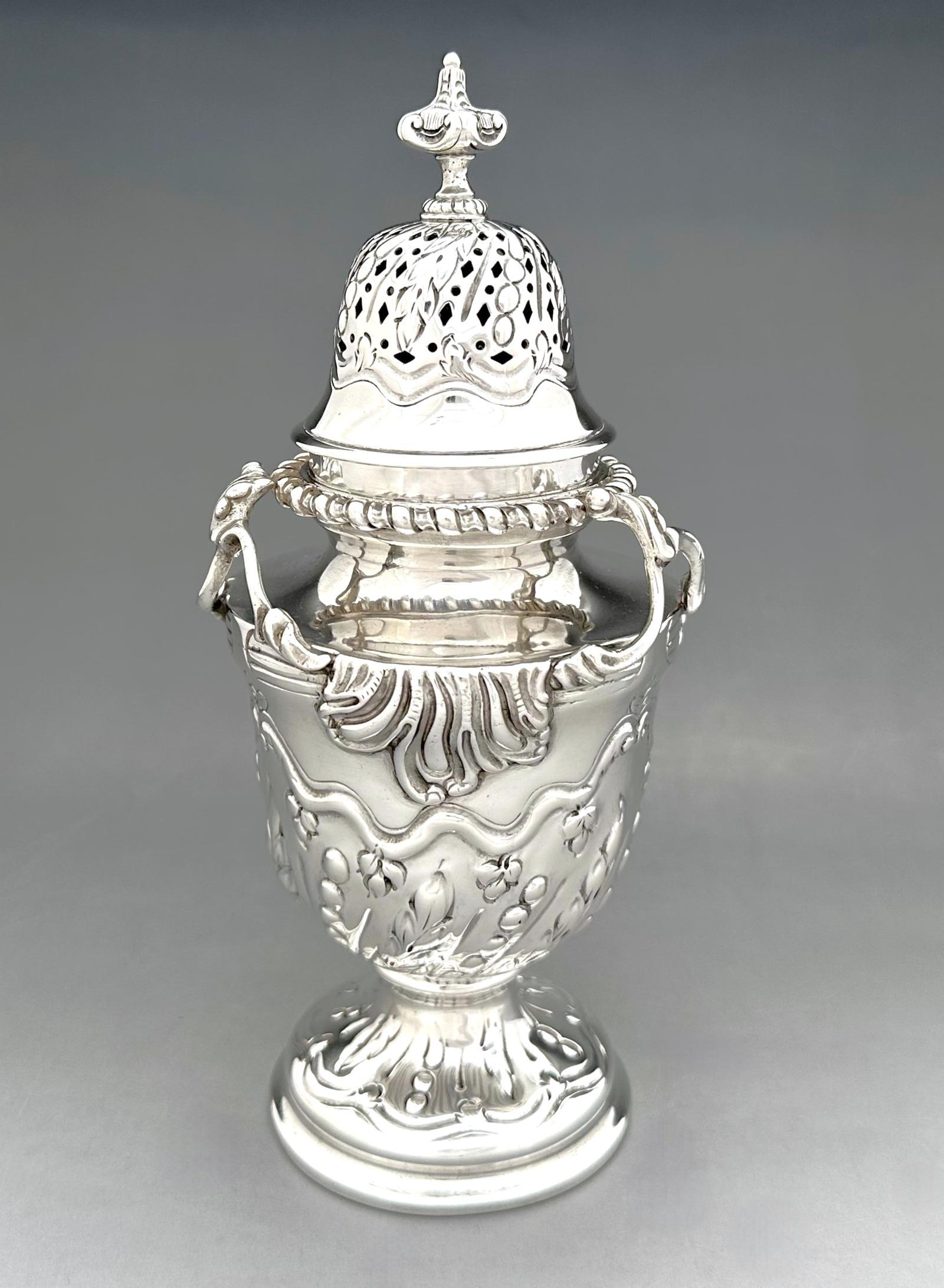 The round body of this stunning example stands on a raised and decorated pedestal base. The decoration is repeated to the body in wrythen form and features floral and foliate motifs. The neck is stepped and elevated with wonderful cast Acanthus leaf details and three applied cast flying scrolls, the latter reaching upwards towards the rim which is finished with a gadroon border. The push fit lid continues the stylized floral and foliate motifs and is pierced with circular and diamond shaped holes. This fabulous caster is completed with a cast finial and certainly commands attention on the table. A high quality piece of usable late Victorian silverware, by a desirable and collectable maker.