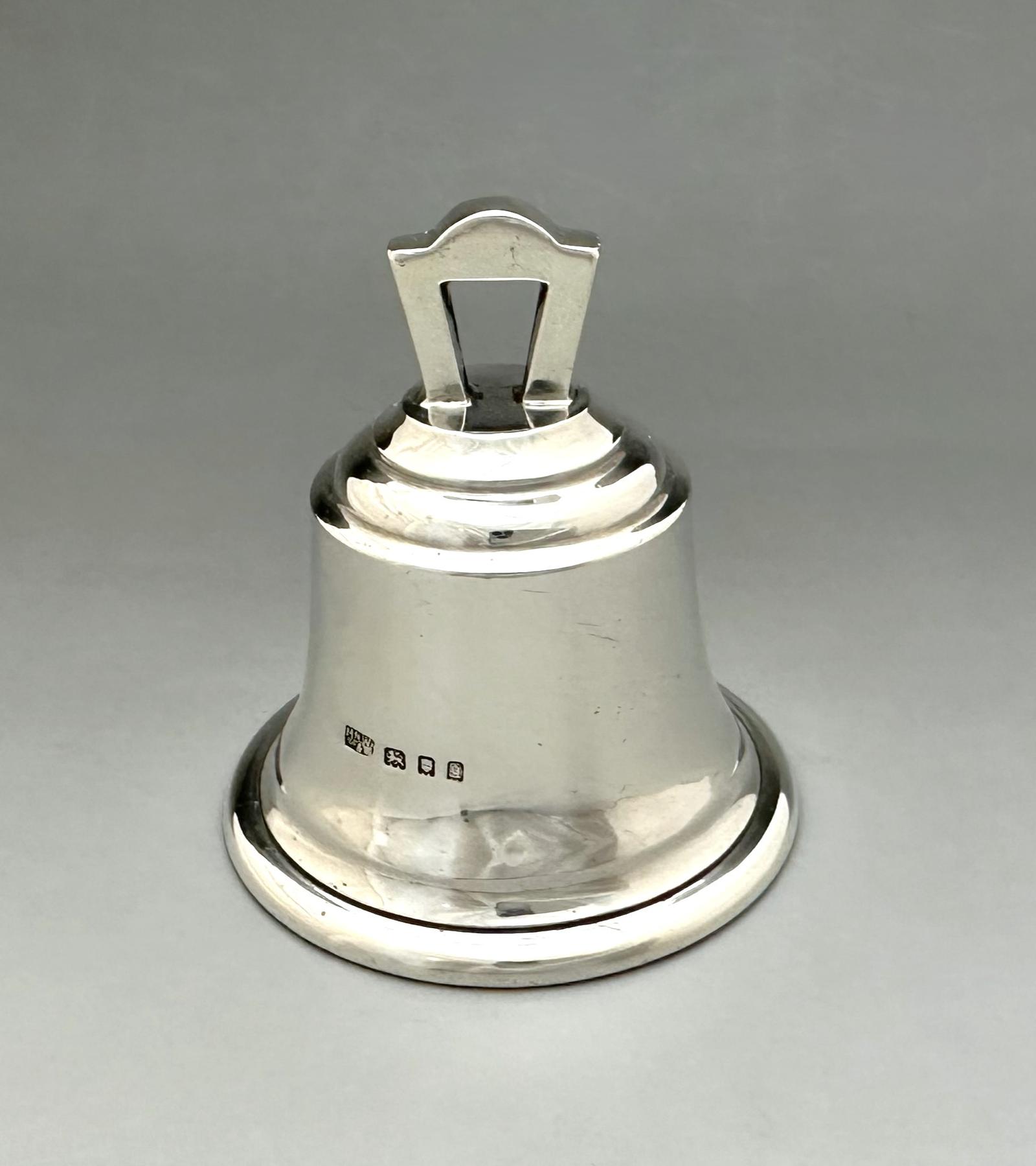 An excellent silver table bell dating from the reign of George V. This charming and rare piece is formed in the shape of a Church bell, with flared mouth and a shaped headstock handle. To the inside is a part marked silver clapper in droplet form hung from a wire work frame, giving the bell a pleasant ring. Ideal for use in the home or on a reception desk.