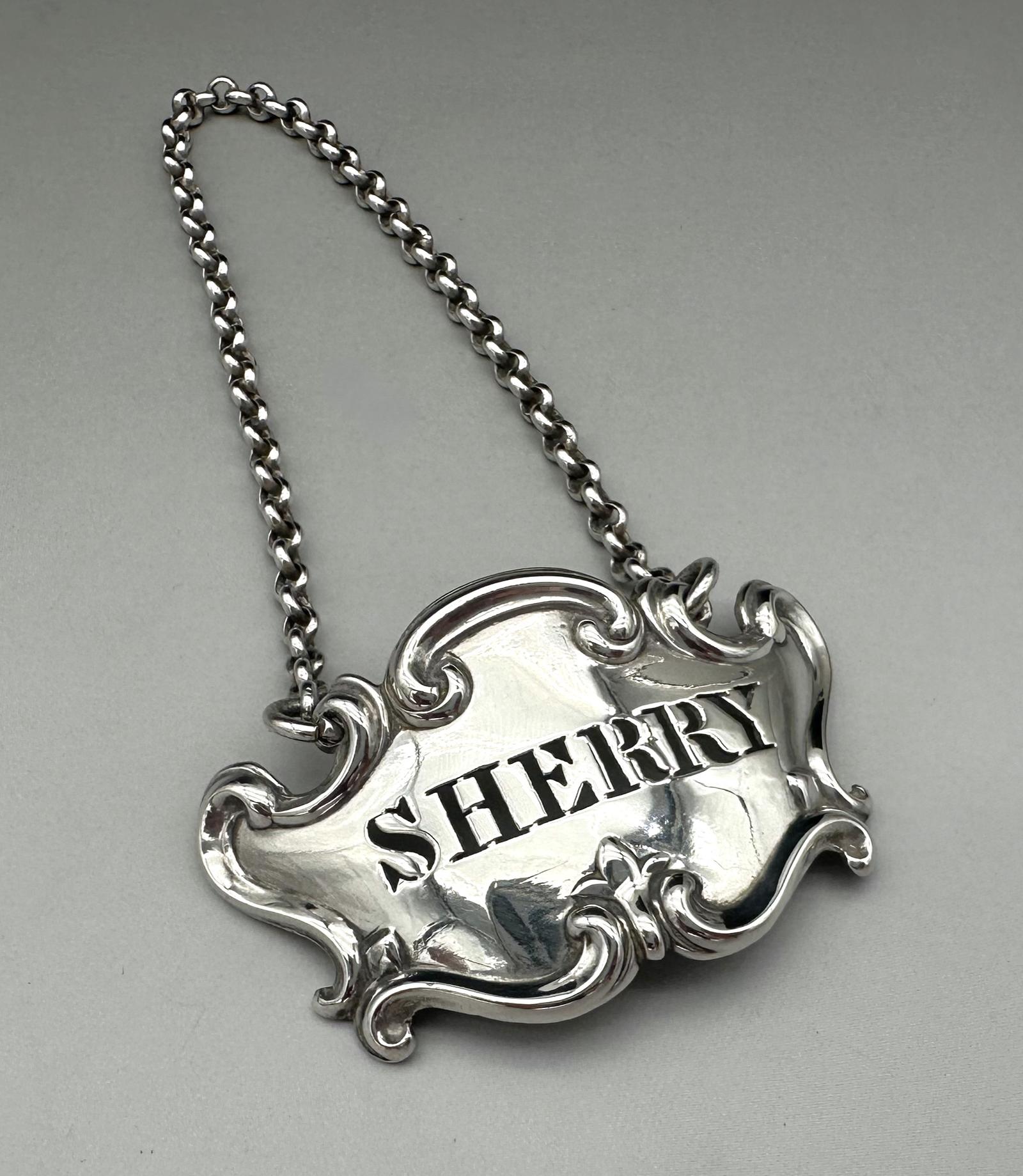 A quality early Victorian silver wine label. This lovely example is of superior gauge silver. The label is shaped with a turned over scroll border. To the centre Sherry is pierced through in capital letters. The label is suspended with a belcher chain and has full hallmarks to the reverse. A great piece, ideal for the decanter and for collectors of wine labels.