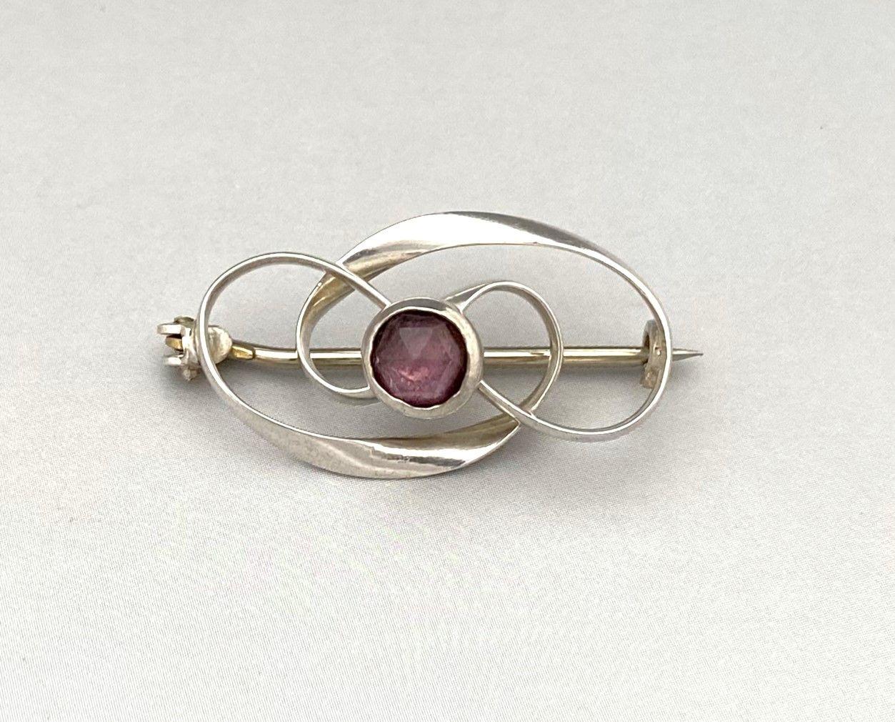 This is an attractive silver brooch set with a central Amethyst paste stone. The body of the brooch is in the Art Nouveau style, with lovely interconnecting sinuous lines, very much of the period. The amethyst is facet cut and set in a bezel mount. The brooch is secured via a pin and C clasp. A timeless and elegant piece.
