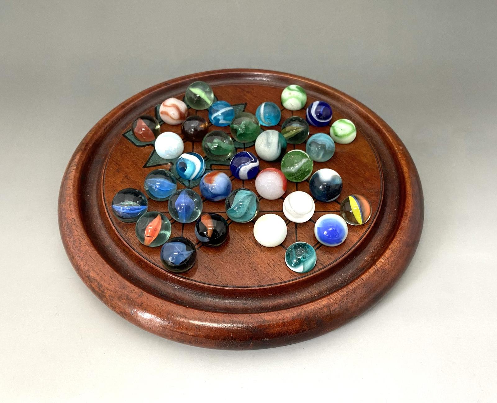 Attractive English solitaire board with glass marbles dating from the end of the Victorian period. This collectable piece is made from mahogany and is beautifully carved and decorated. The board sits on three bun feet and comes with a full set of glass marbles, some being Victorian examples. The board also comes with a handy guide to Solitaire for beginners, or those who need a refresher in how to play this timeless game.