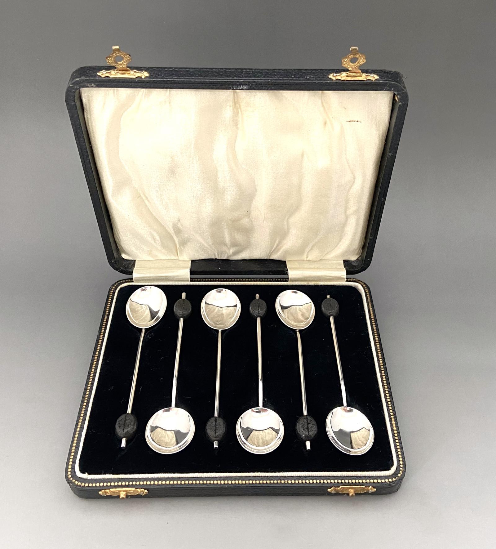 Charming set of six silver coffee or demitasse spoons, presented in their original box. This set has a elegant and simplistic design and dates from the stylish Art Deco period. The hallmarked bowls are rounded with wire work stems and each spoon is finished with a coffee bean terminal. A good, usable set and nice gift idea.