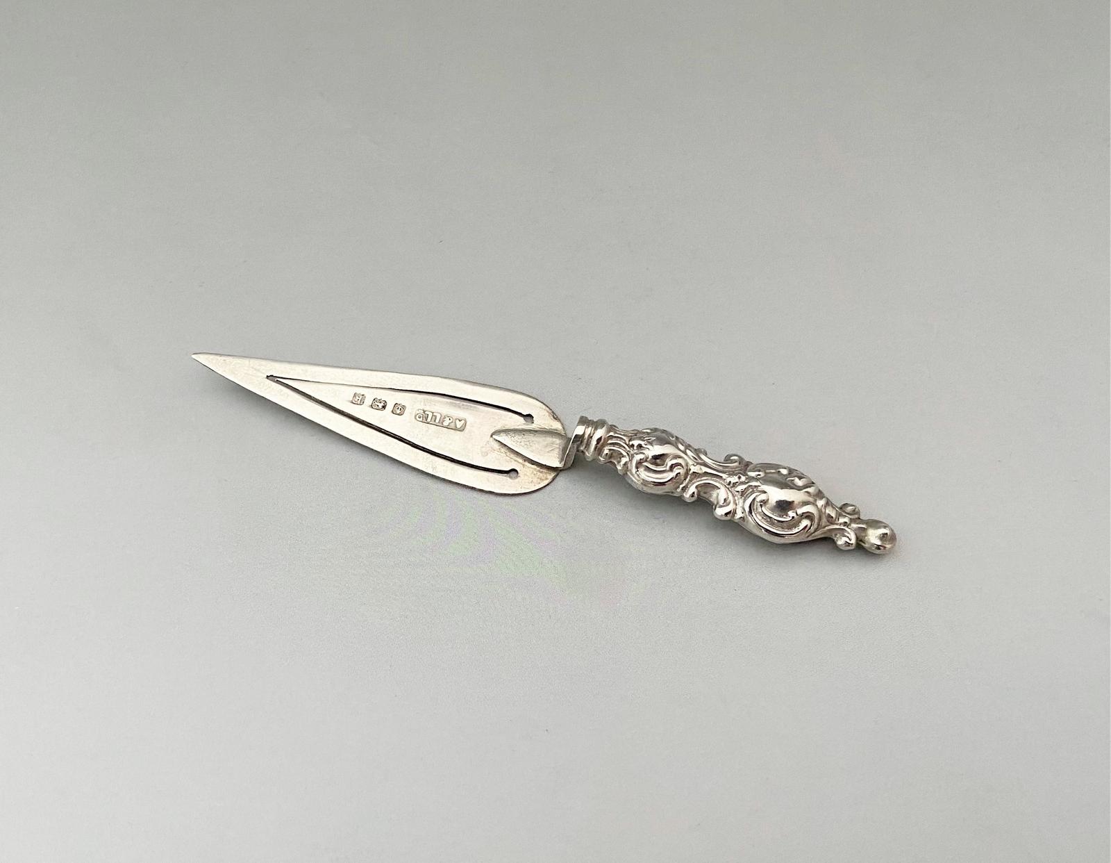 This is a charming Edwardian antique all silver bookmark in the form of a trowel. This delightful collector's item has a rococo handle featuring foliar details and the blade is in the shape of a trowel. An ideal gift idea, being both decorative and practical.