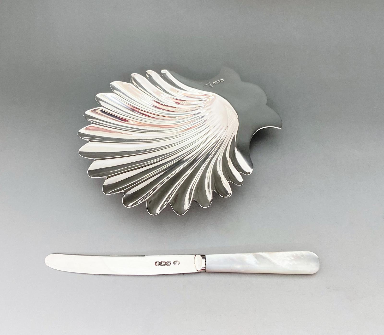 A gorgeous silver butter dish from the beginning of the elegant Edwardian era. This attractive example was assayed at the Sheffield Office and is of good weight. The fluted body is of shell form, with three cast seashell feet and the handle is scallop shaped, with no inscriptions or monograms. Butter shells are lovely items, with alternate uses for condiments, bonbons and trinkets. Presented here with an associated silver and mother of pearl handled butter knife, it is a ready to go useable piece and a great gift idea.