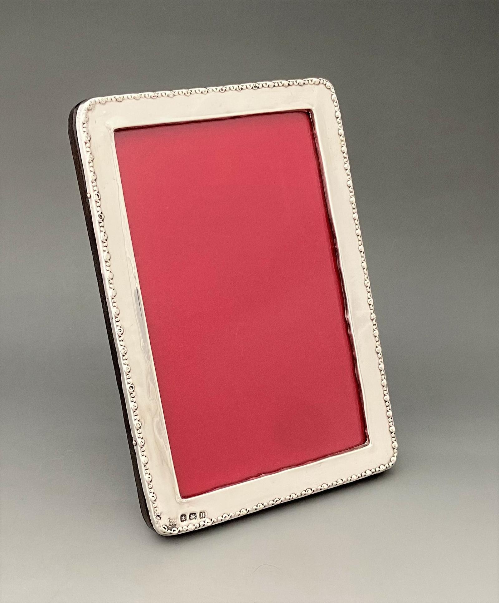 Lovely George V silver photo frame of rectangular form. This useful and attractive example is of easel construction with an oak wooden back and a stylish silver body, with a decorated border. A lovely period example, ready for immediate use.