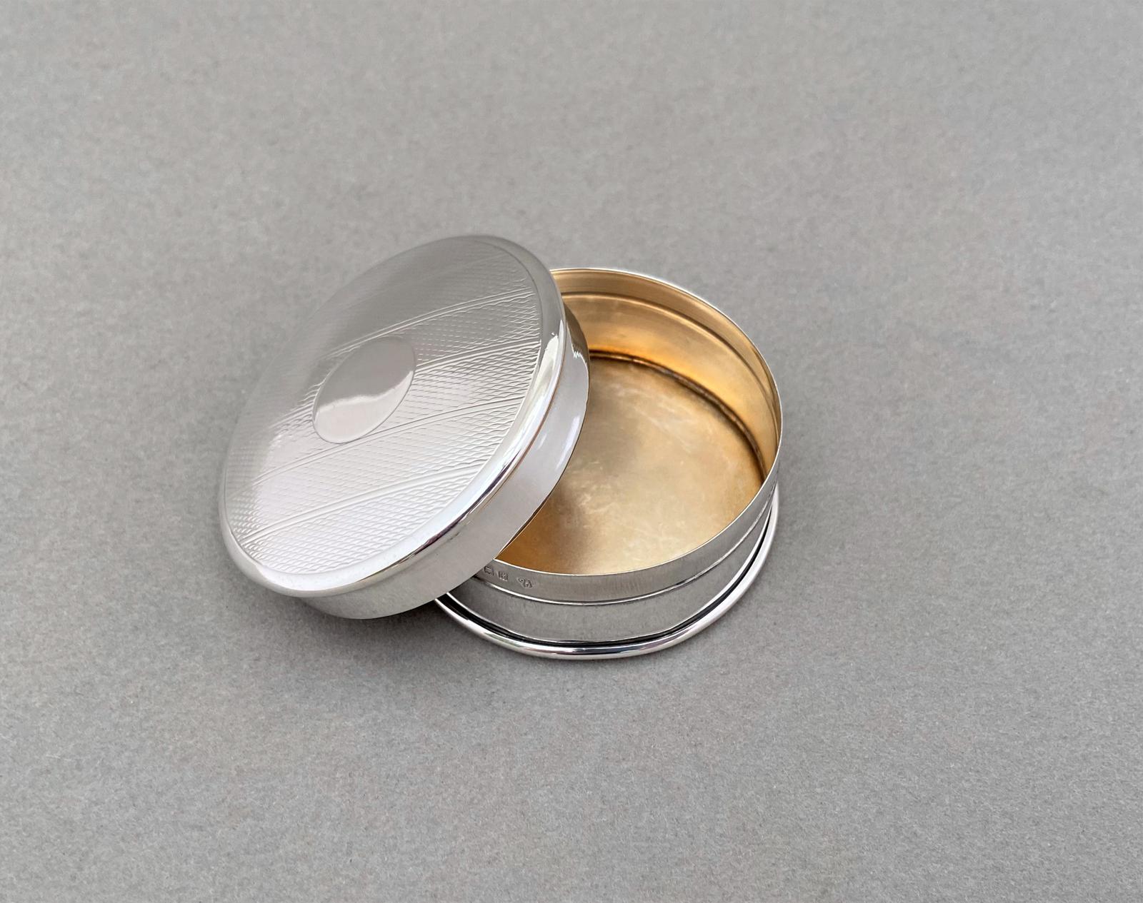 A charming small silver trinket box, with alternative uses as a large pillbox or for pins. The box has engine turned decoration, with a vacant circular cartouche and has a pull-off lid. The interior is fully gilded. A good example, both practical and collectable.