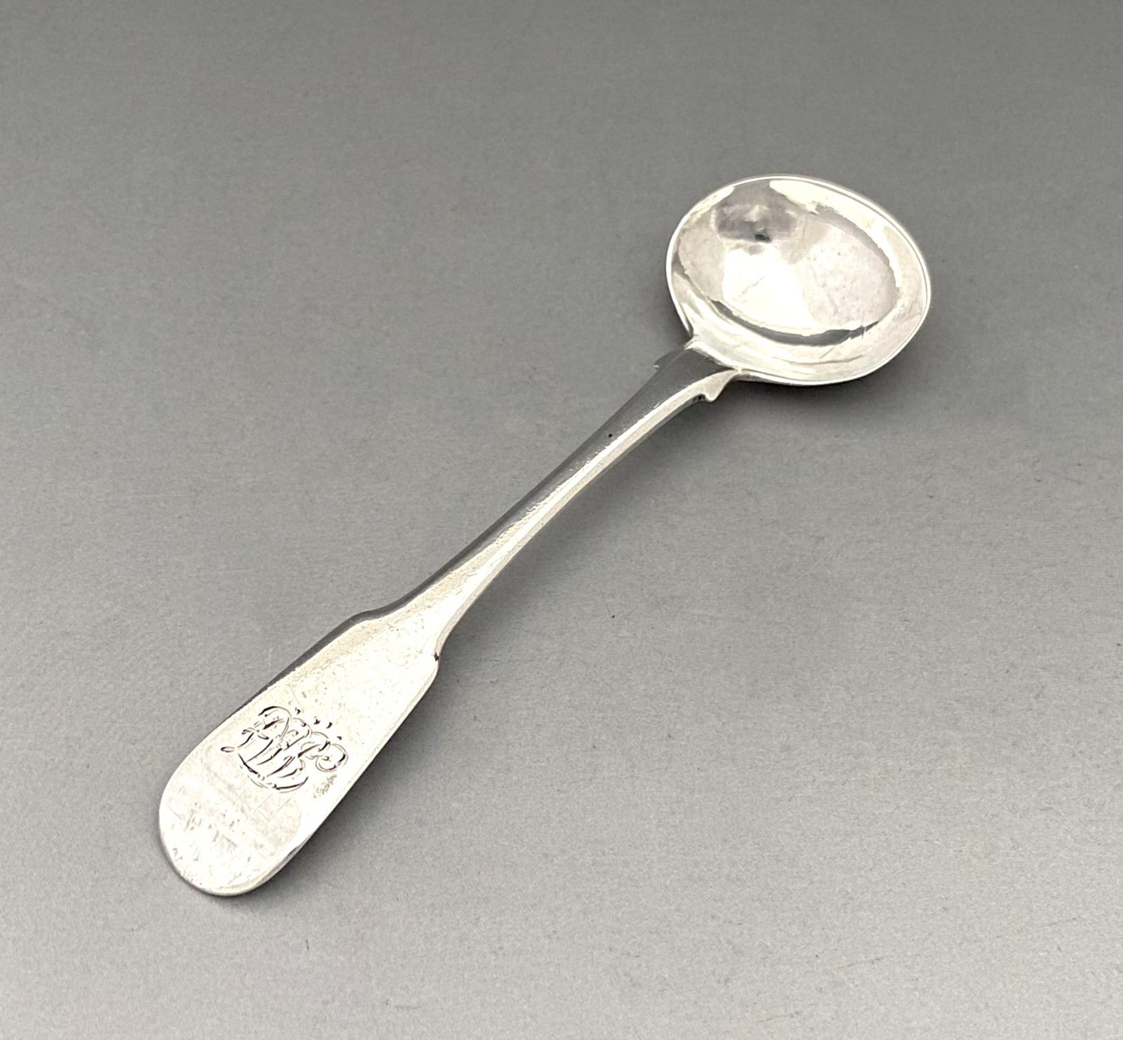 A useful silver Fiddle pattern salt spoon from the reign of George III. This lovely example was assayed at the collectable Newcastle Office and has engraved script initials to the top of the shank. Flatware is rather scarce nowadays due to the great losses, caused by the unscrupulous melting of antique silver for scrap. Therefore an example from a sought after Assay Office is a good find.