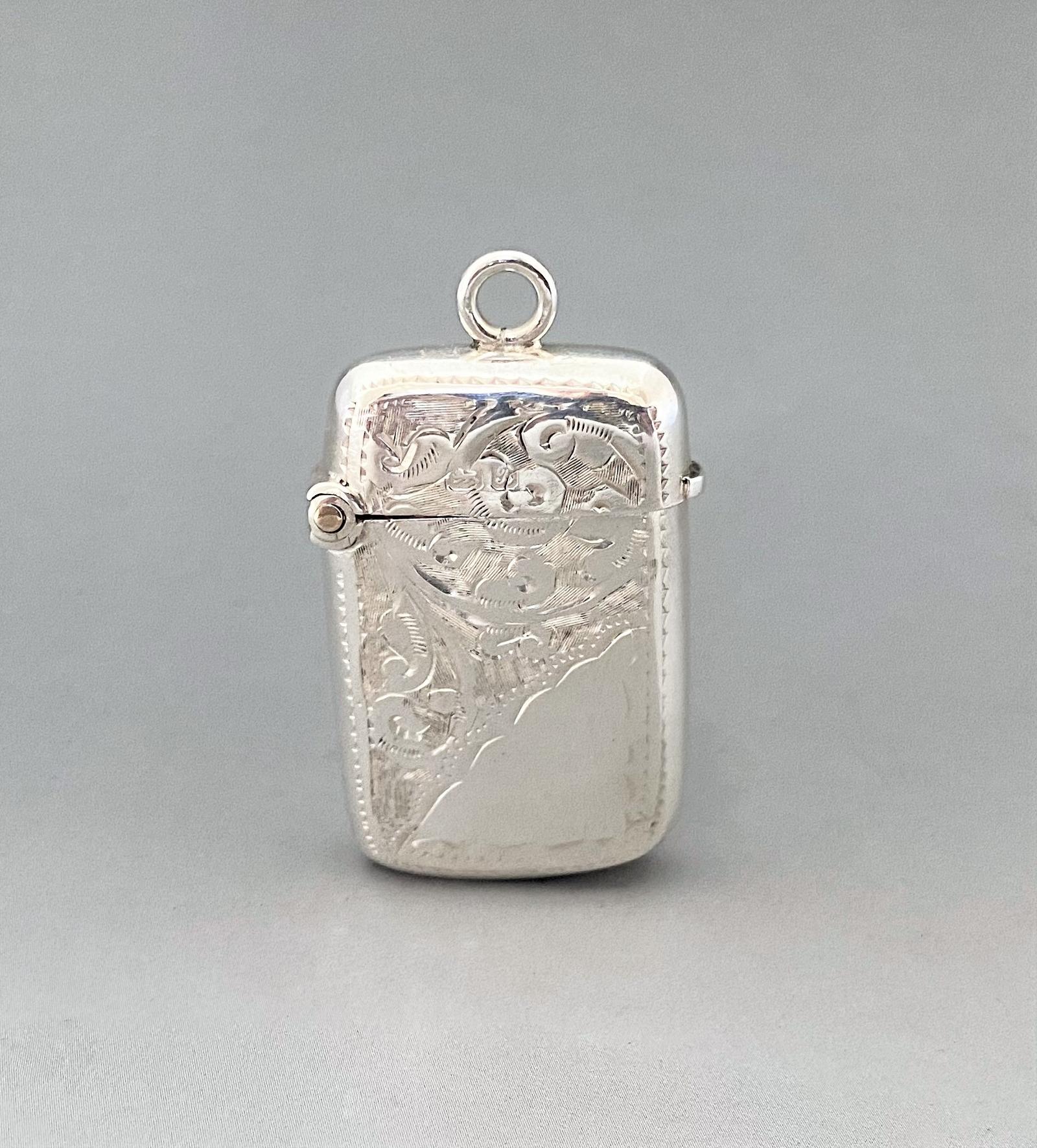 A charming Edwardian silver vesta, assayed at the sought after Chester Office. This lovely and petite example, has acanthus leaf engraving to the front and a vacant corner cartouche. To the top is an attaching ring for fob chain or chatelaine. A good collector's piece, with an unusual design.
