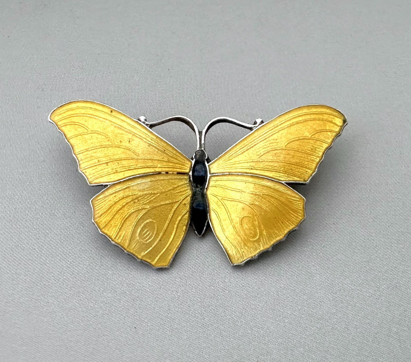 A delightful Sterling silver brooch in an attractive golden yellow. The guilloche enamel is of lovely quality, with the decoration and veins of the butterflies wings being clearly visible. The body is in a contrasting black enamel and the brooch is marked Sterling Silver to the reverse. Fitted with a hinged pin and modern safety pin style catch, it is ready to be worn and enjoyed.