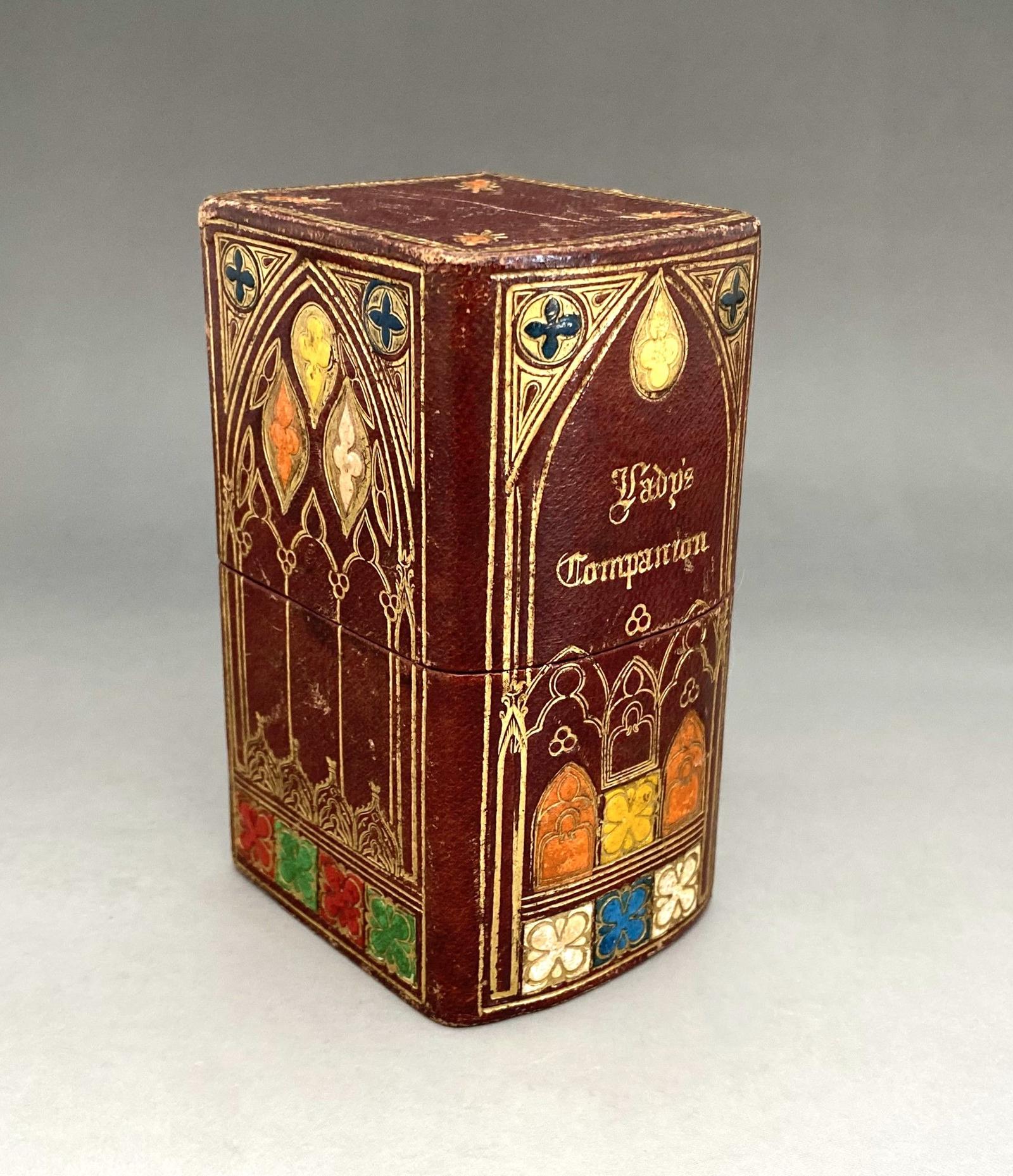 This is a charming example of Victorian sewing ware. This is a cased lady's sewing companion in a highly tooled, decorated and gilded case, formed to look like a book with a pull off lid. The interior is fitted and contains a number of sewing items including steel scissors and needle case, pen knife and a cotton thread sleeve. The included thimble is of hallmarked Chester silver and the rapier of hallmarked continental silver. A delightful collector's item still usable today.