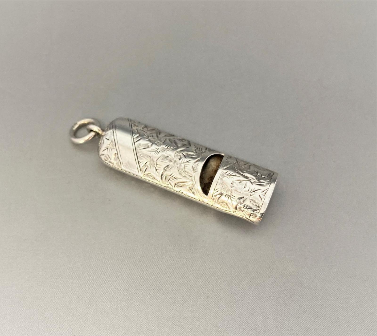 A delightful late Victorian silver whistle, perfect for use as a dog whistle. This lovely example is in good working order and has a hallmarked attaching ring to the base for a fob chain, chatelaine or neck chain. The body is beautifully engraved with Ivy leaves and is finished with a diagonal vacant cartouche to the front. A lovely collectable example and a practical gift idea.