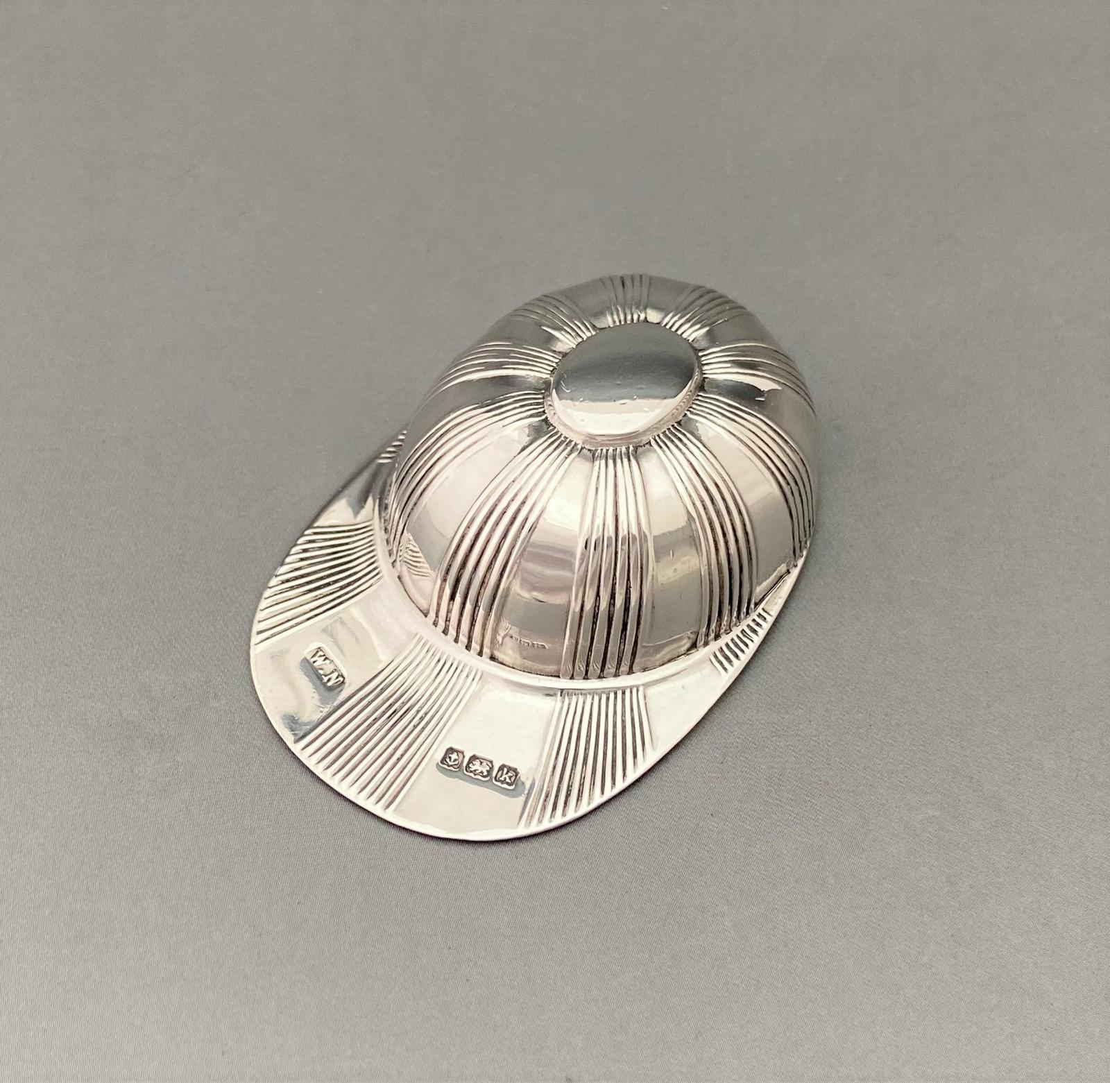 This is a desirable Edwardian silver tea caddy spoon in the form of a jockey cap. The spoon is of good gauge silver and tactile to hold. It has a reeded pattern in alternate panels and a plain central cartouche. Novelty items are always in demand by collectors and this would make a fine addition to a caddy spoon collection, being both usable and decorative. Dimensions below.