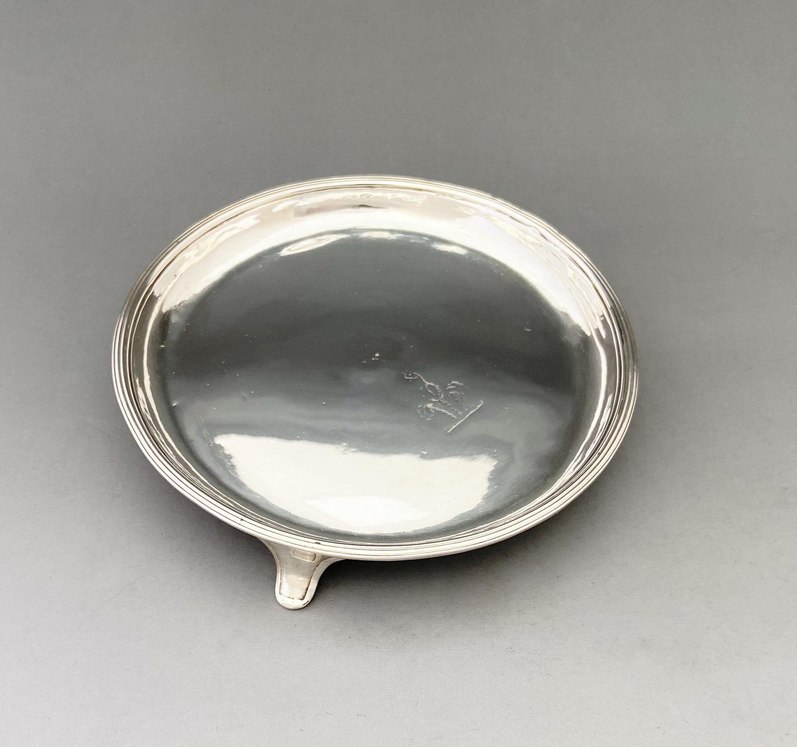This is the most charming silver card tray or waiter from the reign of George III. This useful piece is understated and elegant in design and form. The round body is dished, with a raised and reeded rim and sits neatly on three banded feet. The centre is plain and features an engraved armorial. A lovely, usable piece of 18th Century Georgian tableware
