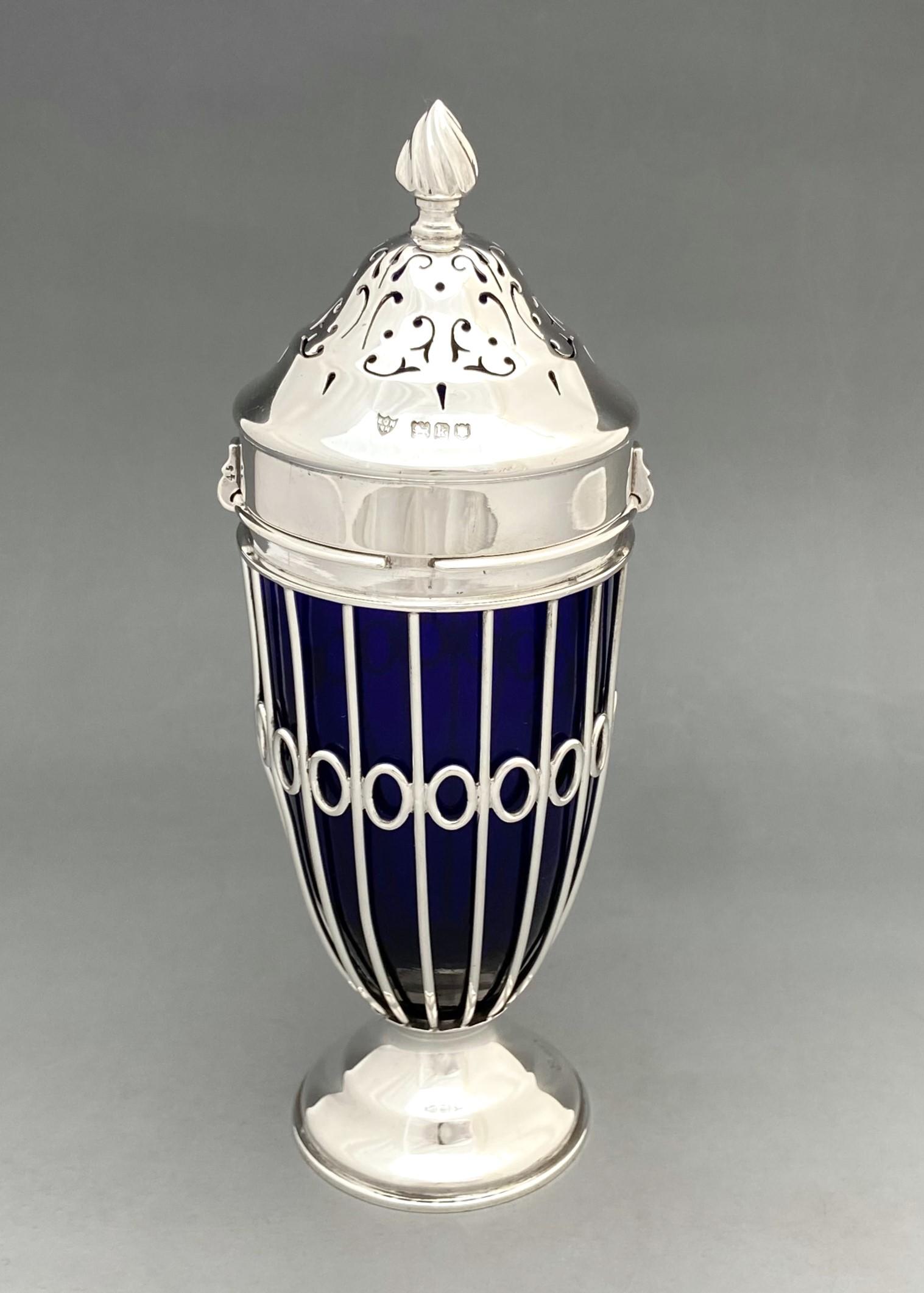 Elegant and attractive Edwardian silver sugar caster. This lovely example is in the Georgian style, with a wirework goblet shaped body on a pedestal foot. The lid is beautifully pierced, with a flame knop and removed by a bayonet fitting. To the interior is the original Bristol Blue glass liner. A good quality and useful piece.