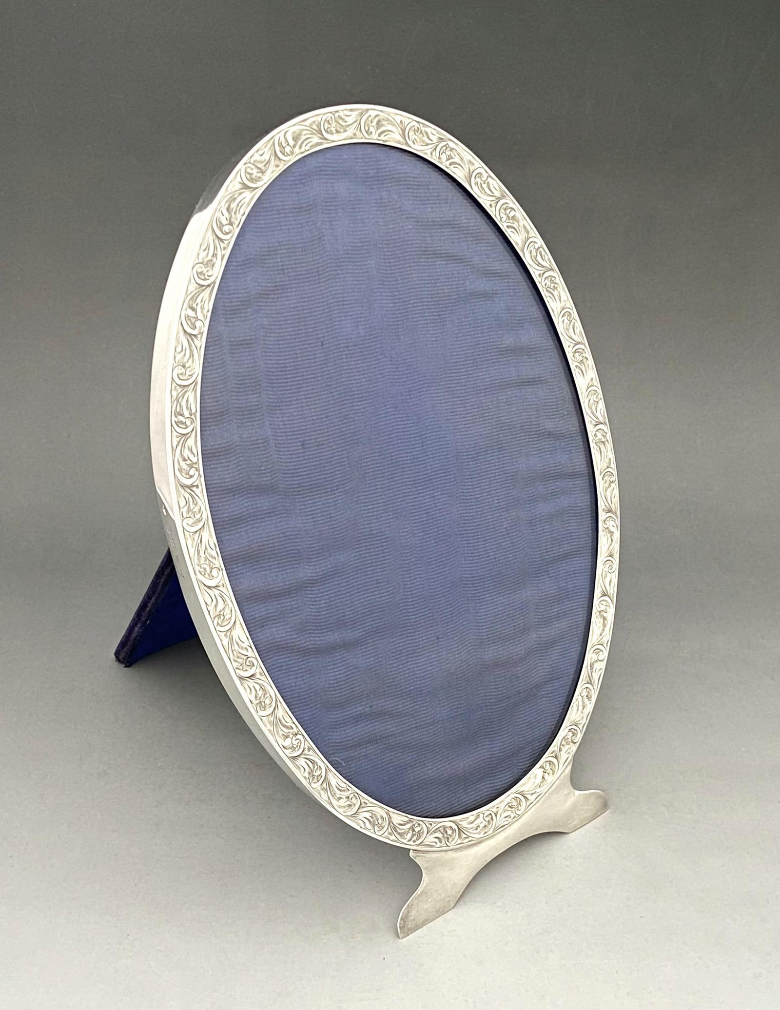 This is an elegant oval silver photo frame from early in the reign of George V. This useful example is of easel construction with a blue velvet lined back. The front is of good gauge silver, stands on a raised silver support and is engraved with attractive acanthus leaves. Perfect for a photo of a loved one or couple.