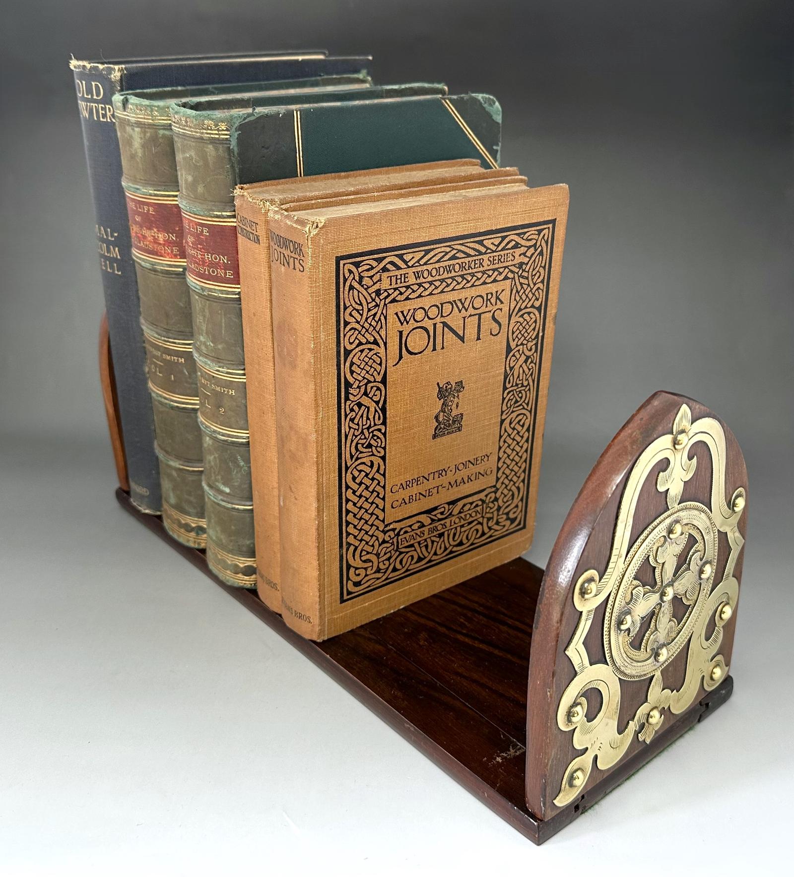 An excellent mid Victorian extending book slide. This charming and usable piece is made of solid walnut and mahogany, with a lovely rich, warm colouring. The hinged ends are arched and have attractive panels of shaped and engraved brass, finished with brass stud work. The base slides on runners and extends to double its closed length. A decorative and useful piece.