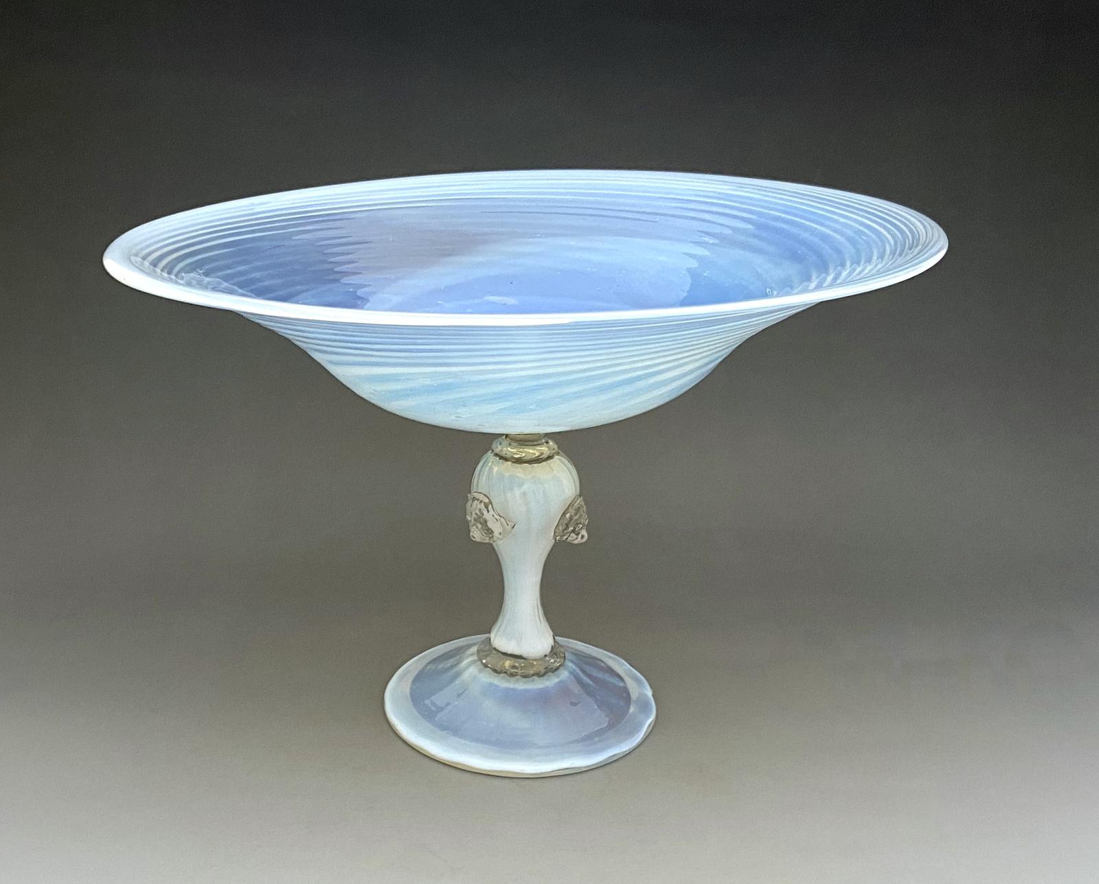 This is an exquisite example of late 19th Century Venetian glass. This wonderful Tazza is of Vaseline glass in a pastel blue and white colourway and is likely to originate from the Salviati glass house in Venice. The bowl, hollow blown stem and foot are all of wrythen form, with the stem also having the addition of three clear glass lion masks. The bowl is dished with a turned over rim and the domed foot is folded with a broken pontil mark to the centre. A fabulous piece, both decorative and usable.