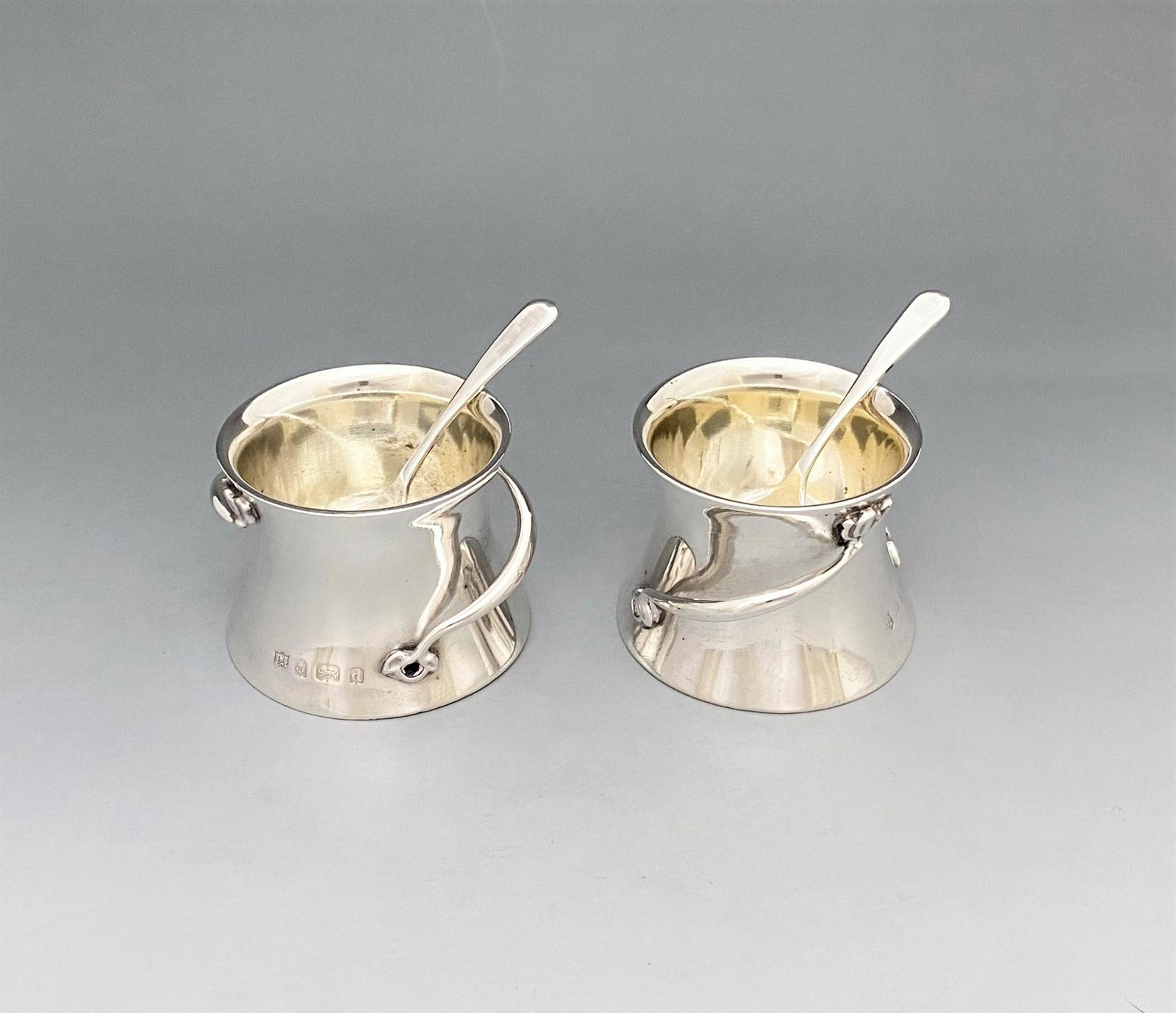 Fabulous pair of Edwardian silver salt tubs in the Art Nouveau style. These lovely examples are of waisted form, with organic twin handles and lightly gilded interiors. The tubs are of good quality and gauge and a pair of associated hallmarked silver spoons complete the set. A lovely pair of condiment tubs with a number of tableware uses.