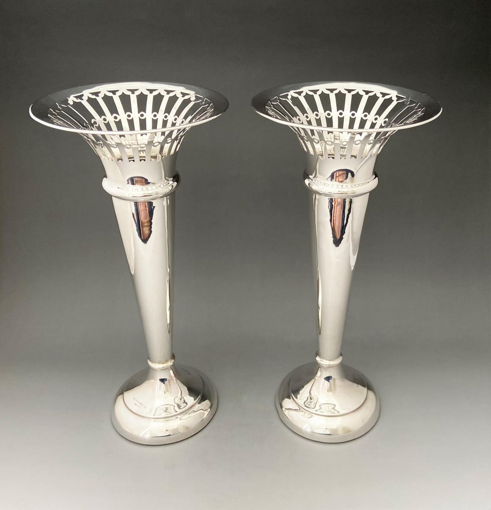 A fabulous pair of substantial silver stem vases from the elegant Edwardian era. These imposing trumpet shaped examples have round, weighted silver bases for stability and wide, flared rims, featuring gorgeous pierced fretwork. Interestingly, the vases were made by a Belfast maker/retailer. Lovely examples of unusual size, both practical and decorative.