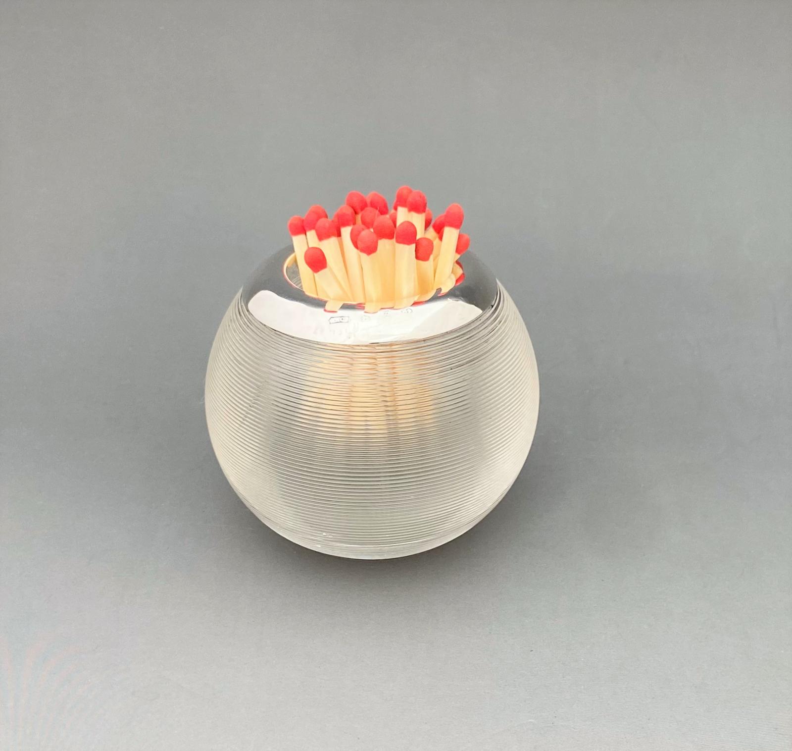 A handsome silver mounted match striker, dating from the end of the Victorian era. The glass body globe shaped, ribbed for striking and has a silver collar surrounding the match reservoir. A good collector's item.
