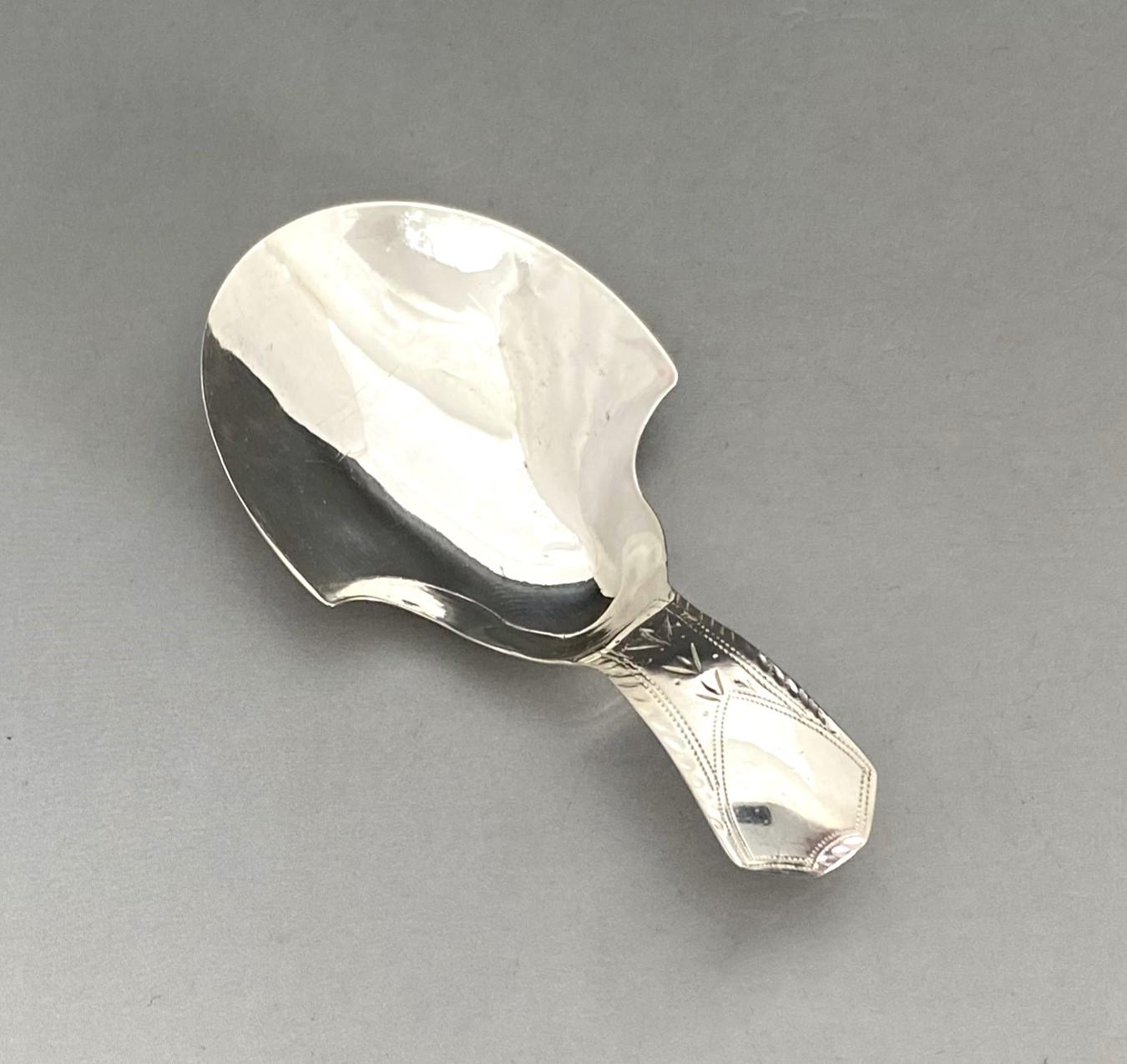 This is a delightful example of a 18th Century silver caddy spoon. The handle is gently curved and decorated with bright cut decoration and a vacant shield cartouche. The bowl is shaped and dished and free from engraving. A lovely and practical piece, both for the collector and the tea enthusiast.