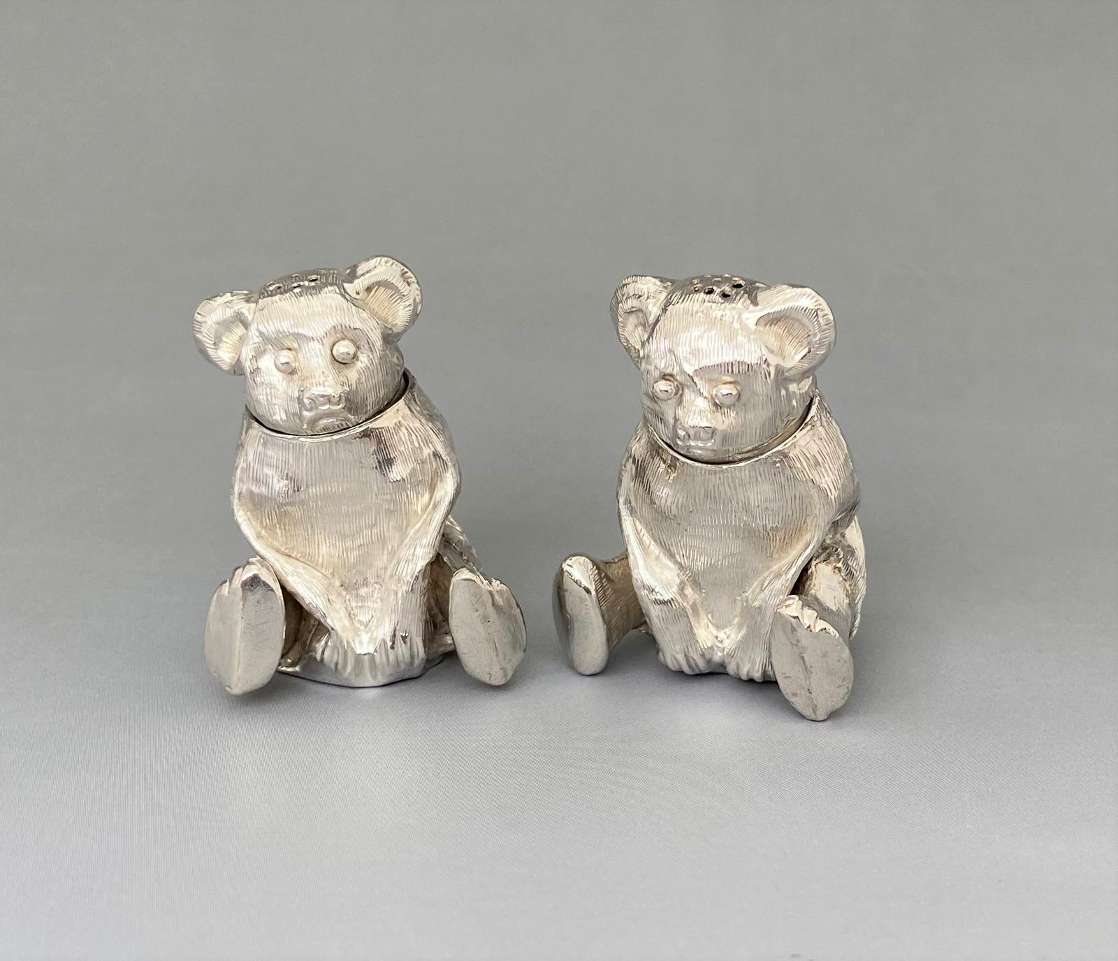 A gorgeous and desirable pair of novelty silver pepperettes. These collectable items are modelled as seated Bears and have pierced holes for dispensing the pepper on the heads. The heads are pull-off to facilitate filling and whether used or kept for decoration, they prove a charming and attractive talking point.