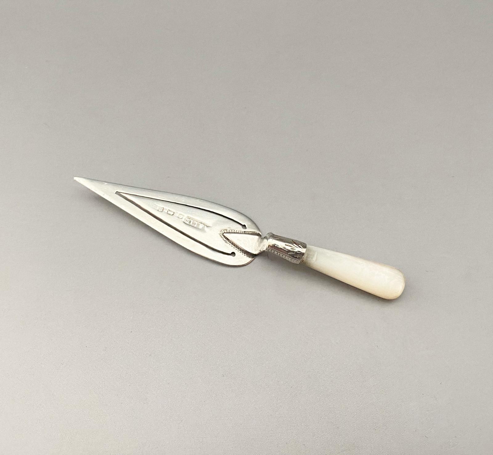 A novelty silver bookmark of trowel form and dating from the end of the Victorian era. This charming example has a mother-of-pearl handle and fully hallmarked blade. A good gift idea and a lovely usable collector's item.