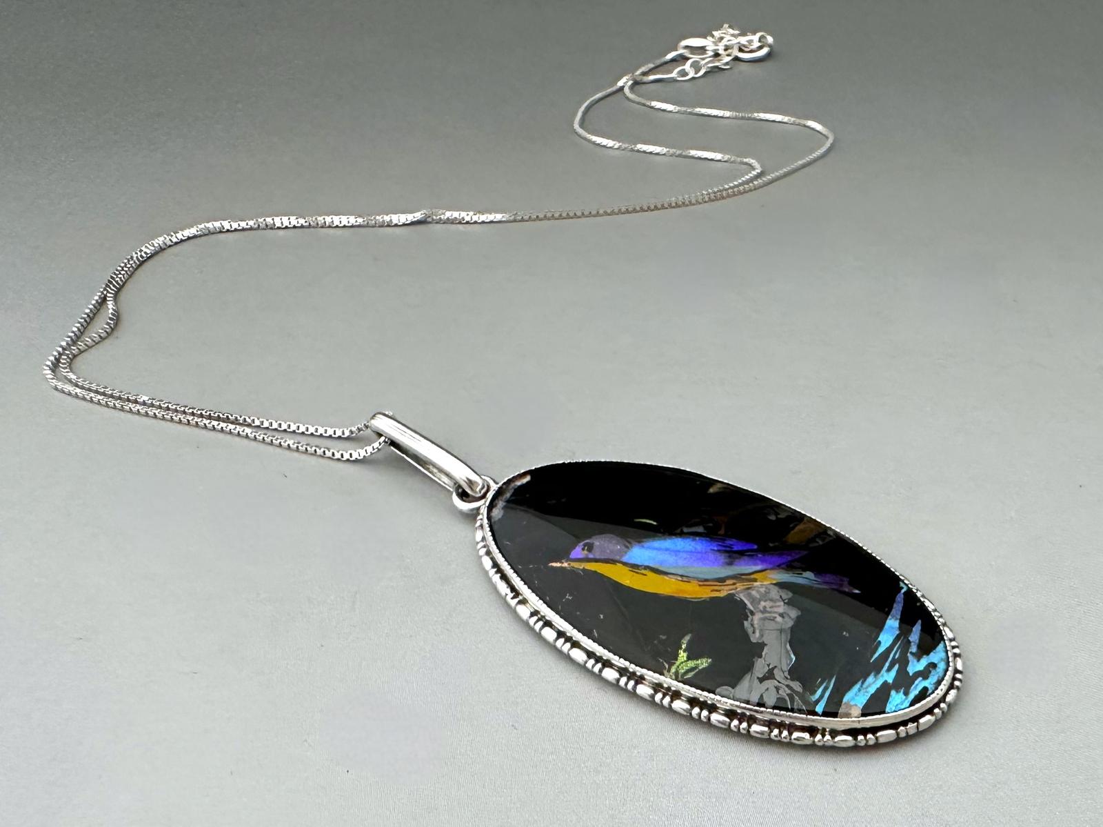 A lovely piece of Art Deco period silver jewellery. This attractive Butterfly wing pendant is of a Kingfisher, with excellent colouring and made by the well regarded Thomas L Mott, known for his Butterfly wing jewellery. It is marked with the patent stamp of 202213, makers mark and Sterling silver to the reverse. Provided here with a 925 silver chain, it is ready to be worn and enjoyed.