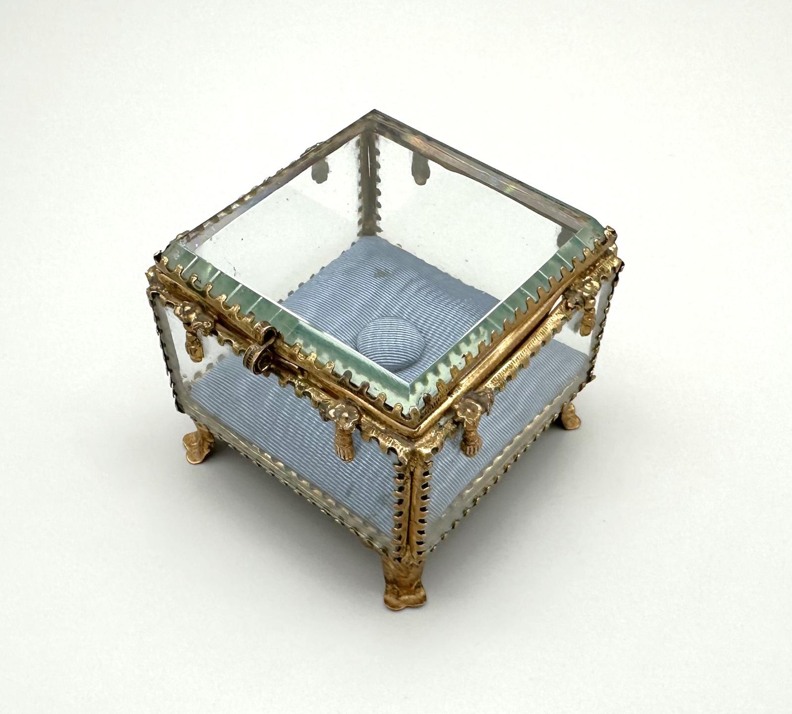 A late 19th Century French glass trinket or jewel box. This lovely example has a delightful decorated Ormolu frame, which includes drops to each side finished floral details. The box stands on four raised and shaped feet and is fitted with a hinged, bevelled glass lid. The original interior is lined with a padded base, with central button in a blue silk moiré. An attractive and usable piece.