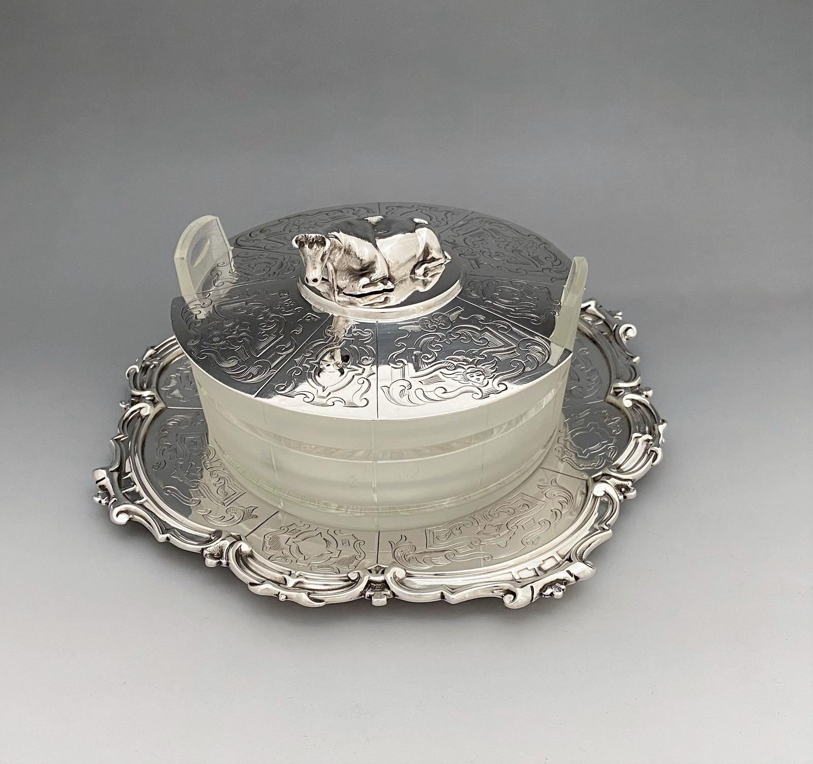 An outstanding silver and glass butter dish from early in the reign of Queen Victoria. This superb piece has a frosted and cut glass body with twin 'lug' handles. The lid is domed and ribbed, with engraved decoration and there is a fully cast, seated cow finial. To the base is a matching silver under-plate with full hallmarks and this silver is of excellent gauge throughout. A rare and usable item of silver and glass tableware.