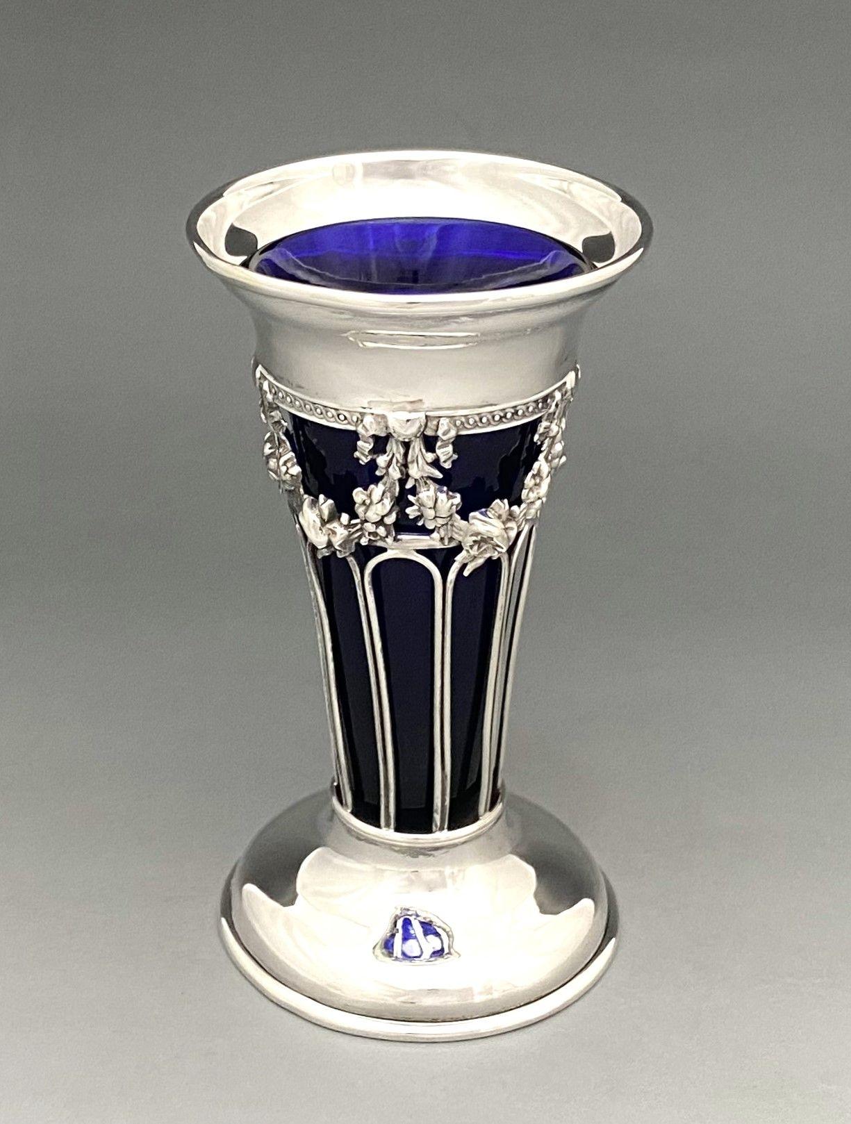 This is a pretty small Edwardian silver trumpet vase with the original Bristol blue glass liner. This wonderful piece has a flared rim and raised base. The tapering body has attractive wire-work supporting bands of garland swags. The glass liner is removable and the vase is both usable and decorative.