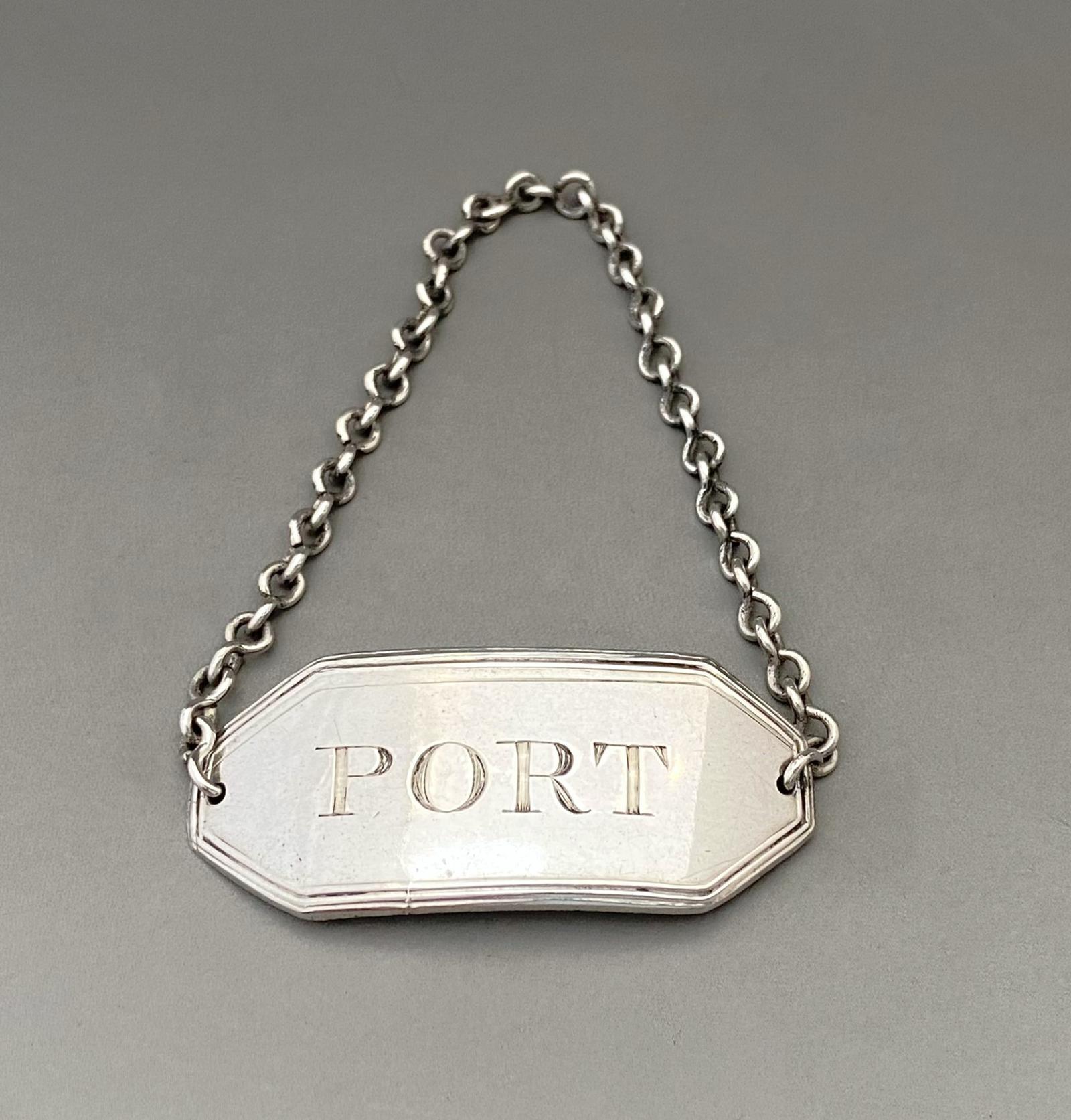 This is a very rare 18th Century antique silver decanter label with early Sheffield assay hallmarks. This wonderful piece is rectangular in shape with squared corners and a reeded border. To the centre is the word 'Port' in pricked capitals. The label is supported on a belcher chain and the hallmarks to the rear are crisp and well struck.