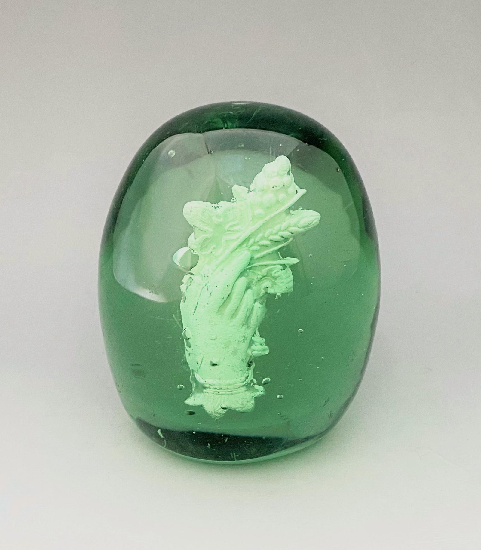 Rare mid 19th Century Victorian antique glass dump or paperweight. This wonderful piece is in bottle green glass and features a sulphide of a hand holding a cornucopia. The body is ovoid with a flattened base for stability, with a number of uses, this is an attractive and very collectable example.