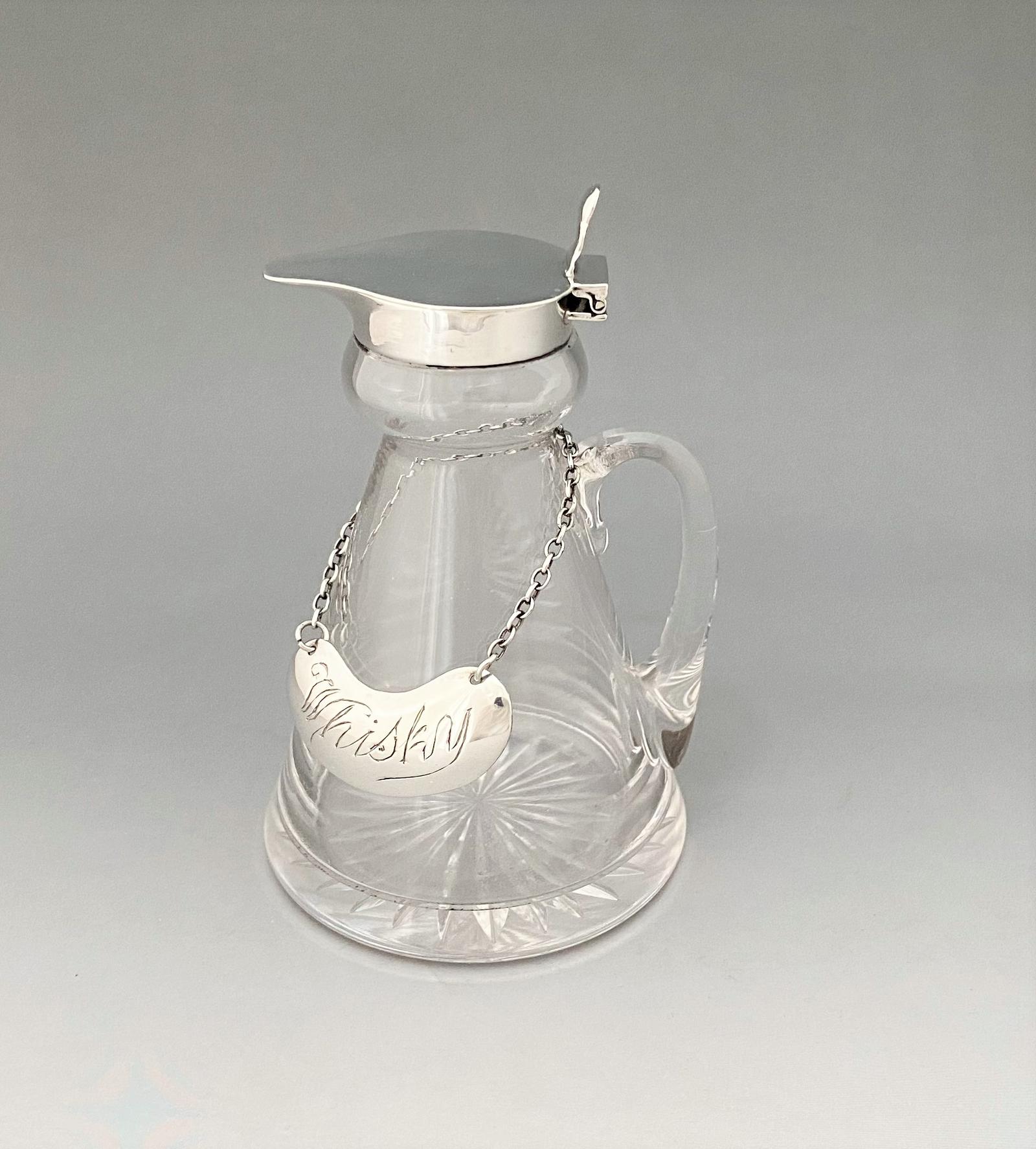 A fine George Vi silver mounted Whisky noggin or tot, with original silver label. The glass body of this delightful example is conical in shape with an applied handle and star cut base. The top is mounted with a hinged silver lid, with thumb grip and pouring lip. The kidney shaped Whisky label is also silver and has matching hallmarks. Whisky tot's are sometimes know as chotopegs and are both usable and decorative.