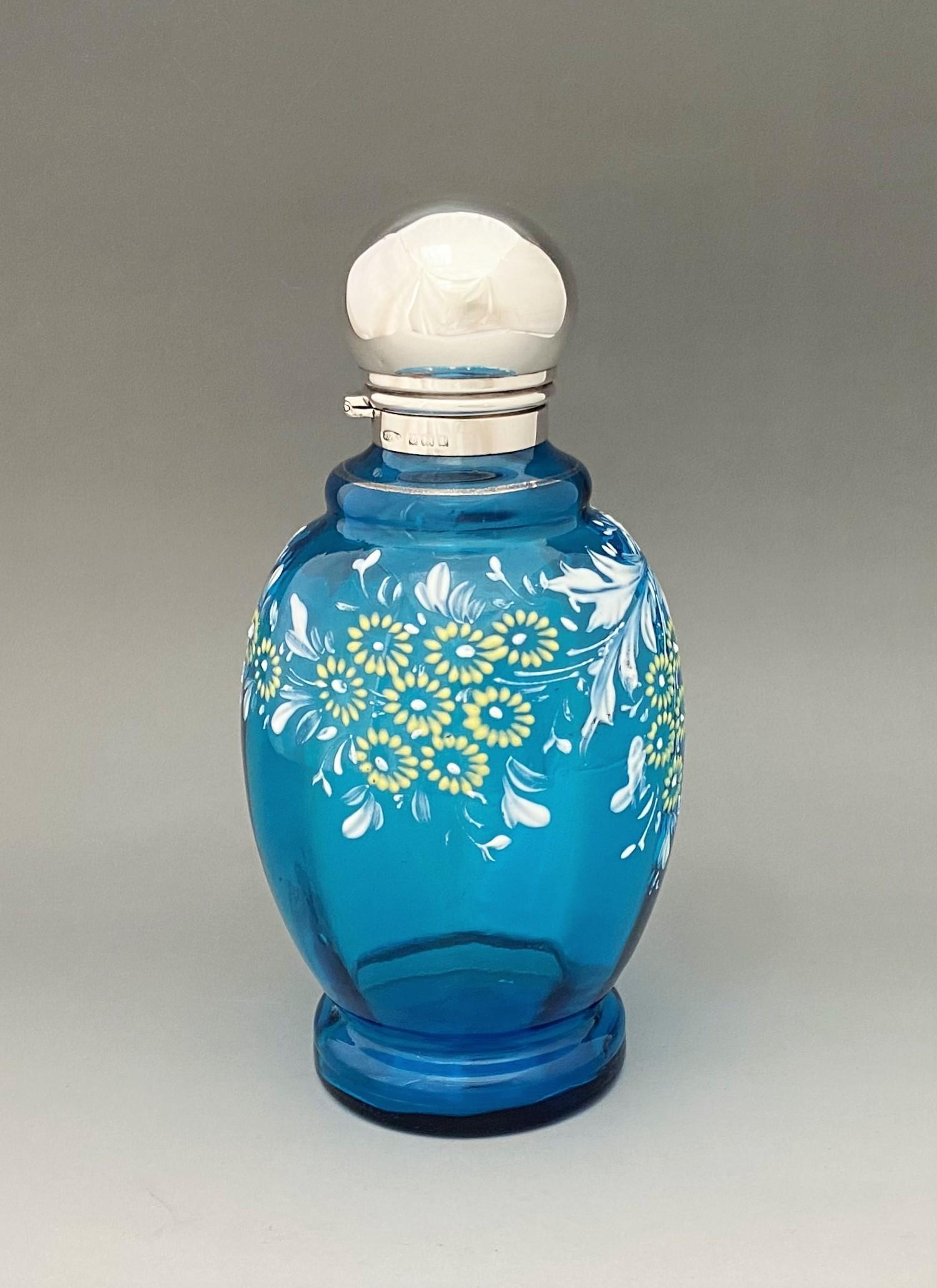 This is a stunning silver mounted cologne bottle from the elegant Edwardian era. This superb example has gorgeous petrol blue barrel shaped body, with optic ribbing and has exquisite enamel painted floral and foliar motifs, in yellow and white. In addition, there is a band of gilding to the shoulder. The domed lid is hinged and is gilded inside. It opens to reveal the original cut glass peg stopper. A gorgeous piece, both usable and decorative.