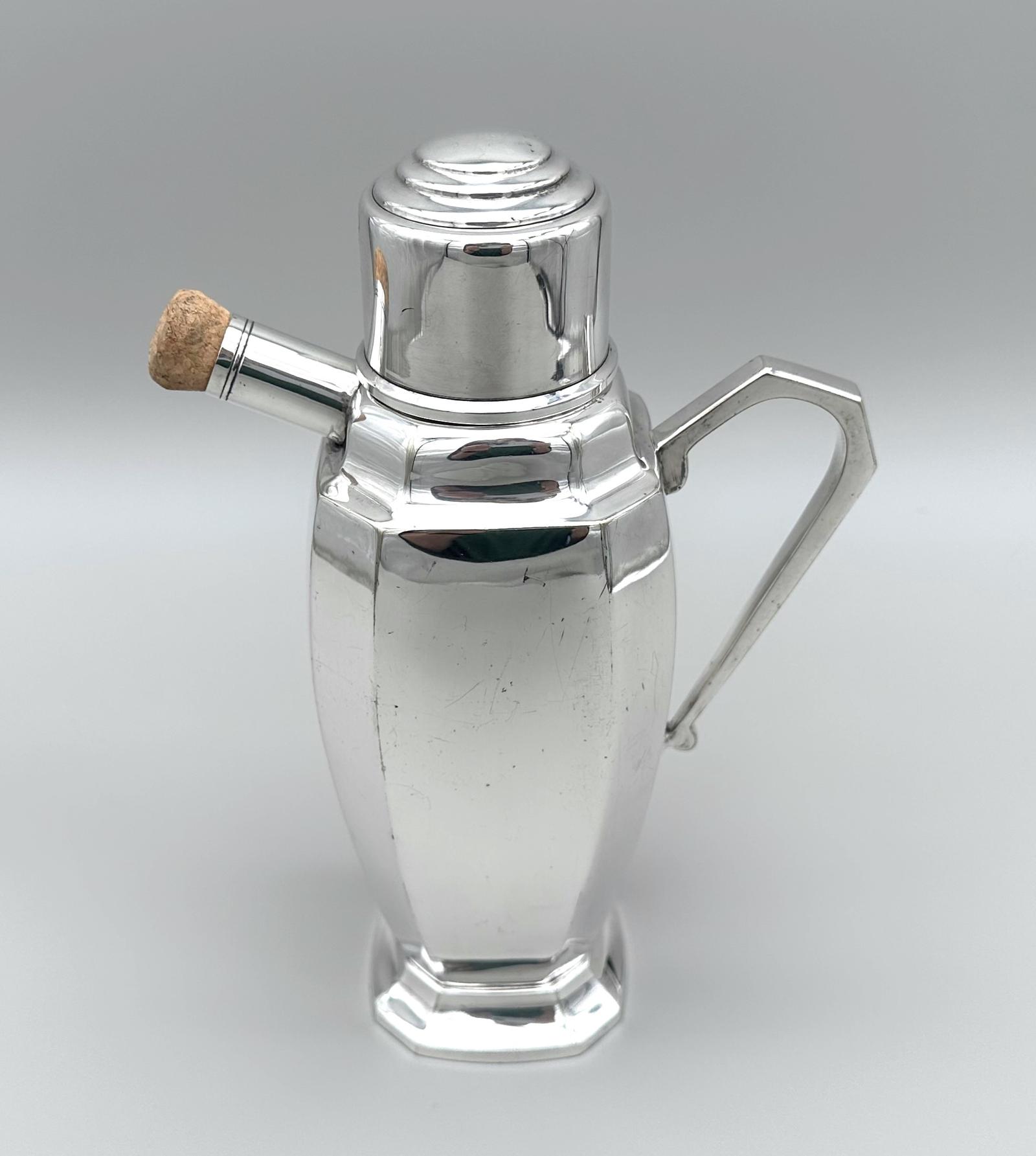 A stylish silver plated cocktail shaker from the Art Deco period, by Frank Cobb & Co. The body is elegantly shaped in the Deco taste with panelled sides, tapering down to a raised pedestal base. To one side is a large angular handle with a useful corked pouring spout opposite. The pull off cap opens to reveal a strainer and internal juicer. To the underside are full Silver plate marks along with makers mark. With the current trend for cocktails, this would make a great 'ready to go' bar accessory or gift idea.