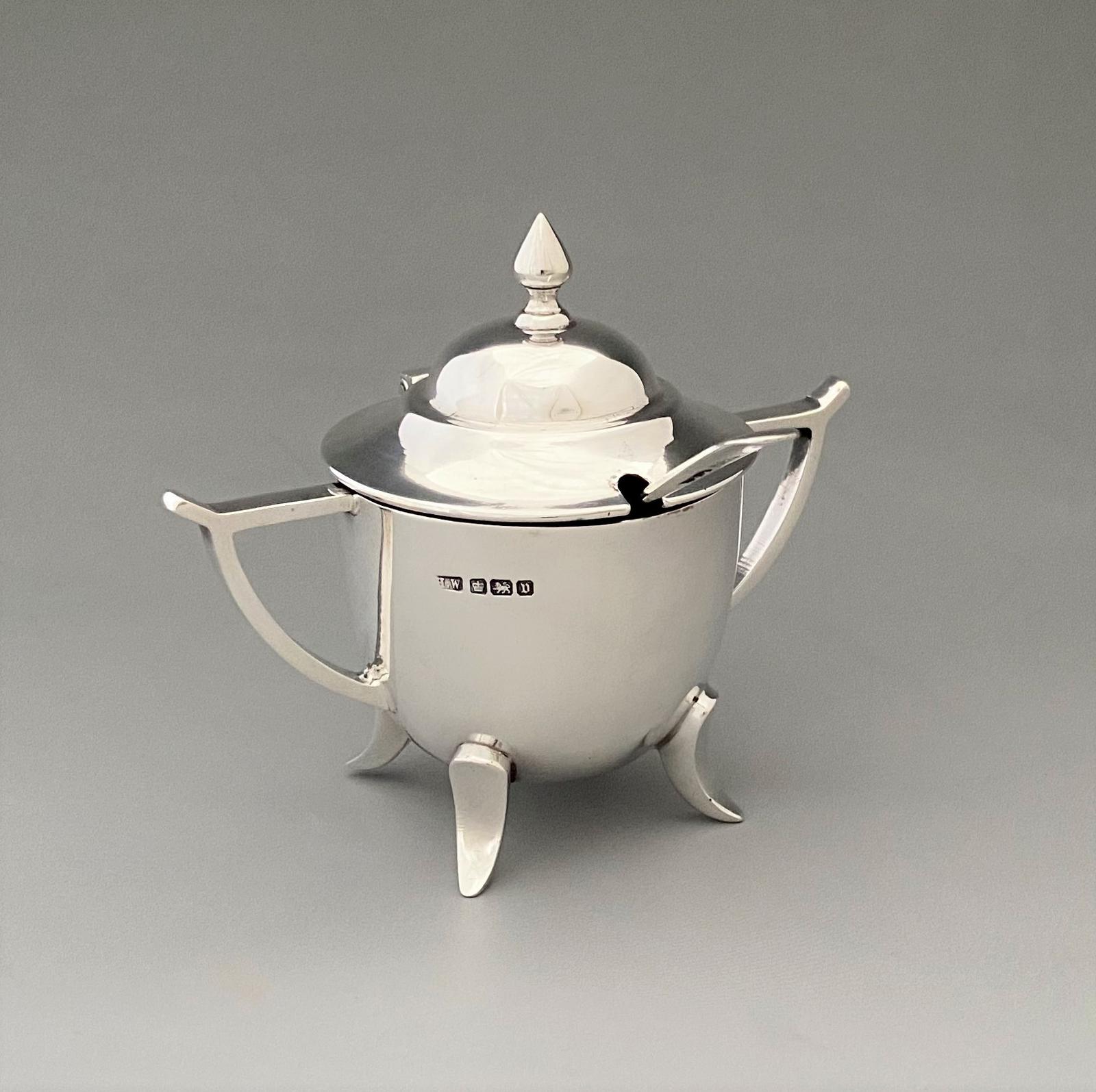 A handsome and stylish silver mustard pot on four peg feet, dating from the reign of King George V. This attractive example has a goblet shaped body with twin handles. The hinged lid opens to reveal the original blue glass liner and there is an associated hallmarked silver spoon, making this a practical and attractive gift idea.