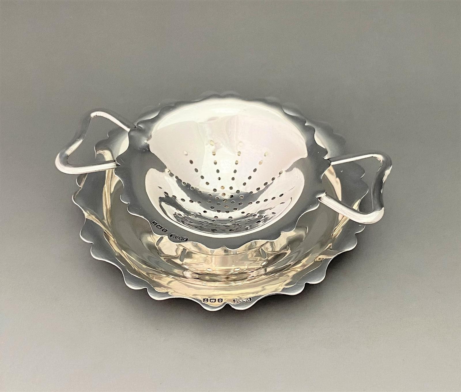 A sought after and practical item in collectable silver. This is a charming silver tea strainer and original matching drip cup of large proportions. The strainer has attractive twin strap handles, with geometric piercing to the bowl and stands on three ball feet. The shaped border is repeated to the matching drip cup which is dished and stands on a raised base. A useful and attractive item.