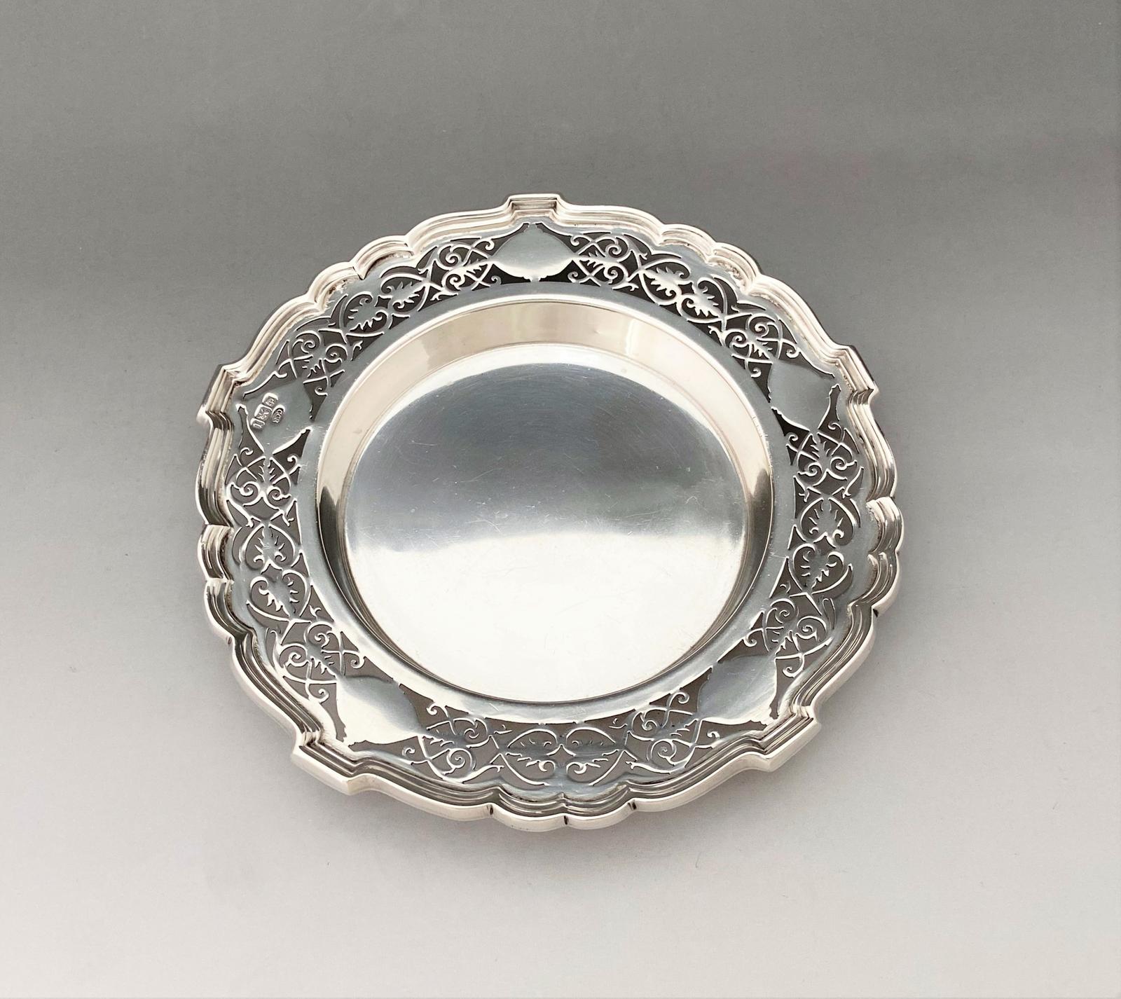 This is a superb hallmarked, pierced silver coaster, suitable for a wine bottle or decanter. This fine example is of good gauge silver and has attractively pierced and engraved rim, with a piecrust border and exquisite patterned fretwork. There is recessed base for stability and the available area would suit a wine bottle, champagne bottle or a small decanter. A good practical piece and an excellent gift idea.