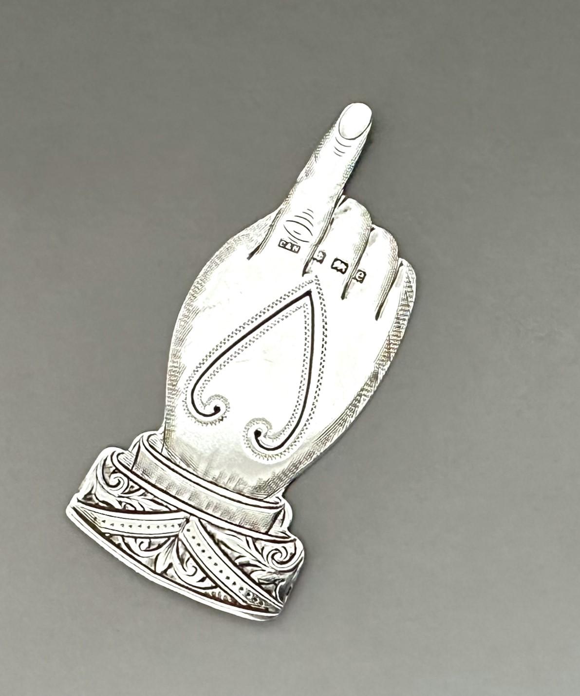 This is a superb bookmark from the Edwardian period. This wonderful novelty example is formed as a hand with pointing finger. The engraving and decoration is excellent, with the detailing being especially realistic. A must have for any book reader or bookmark collection.