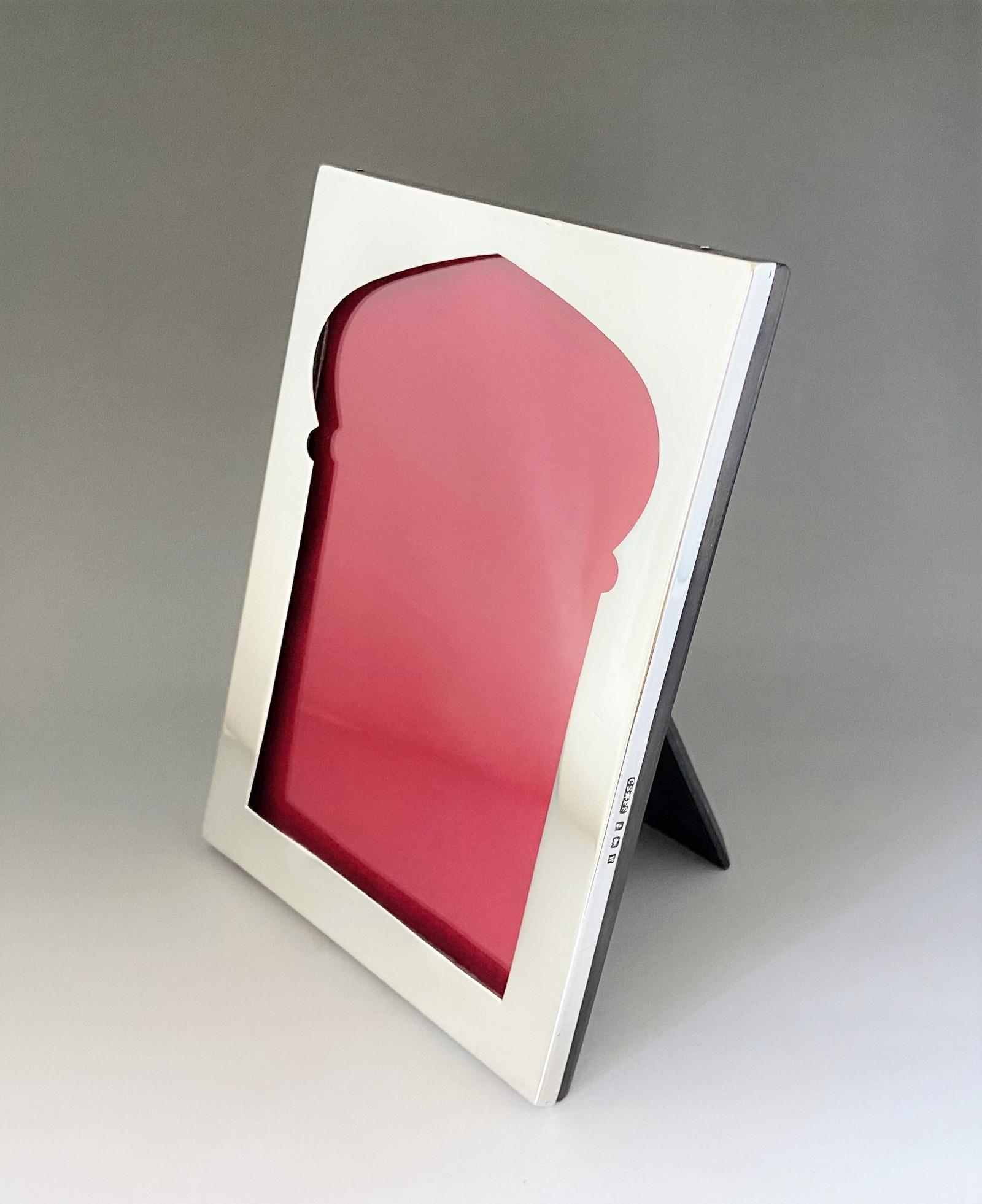 A fine George V silver photo frame of rectangular form. This useful and attractive example is of easel construction with an oak wooden back and a stylish silver body, with an interesting 'Eastern' shaping. A lovely period example, ready for immediate use.