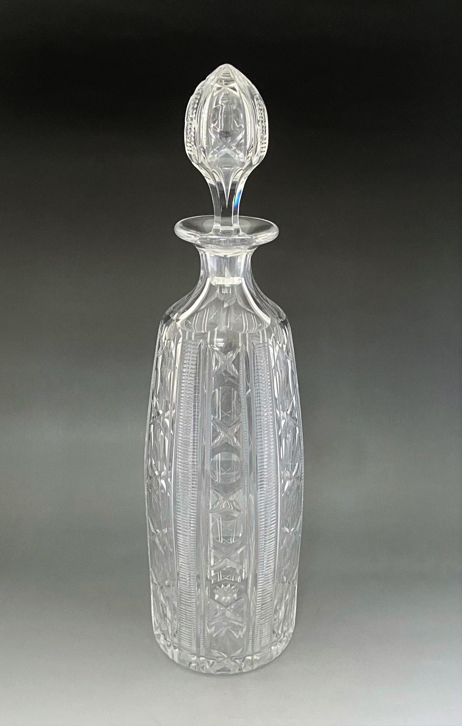 A superb Victorian bottle shaped decanter from the late 19th Century. This charming example has star and notch cut detail on both the stopper and body. The flared collar, sits above slice cut shoulders and the fine quality cutting give a pleasing 'sparkle' to the appearance. An excellent and usable example, suitable for wine and spirits.