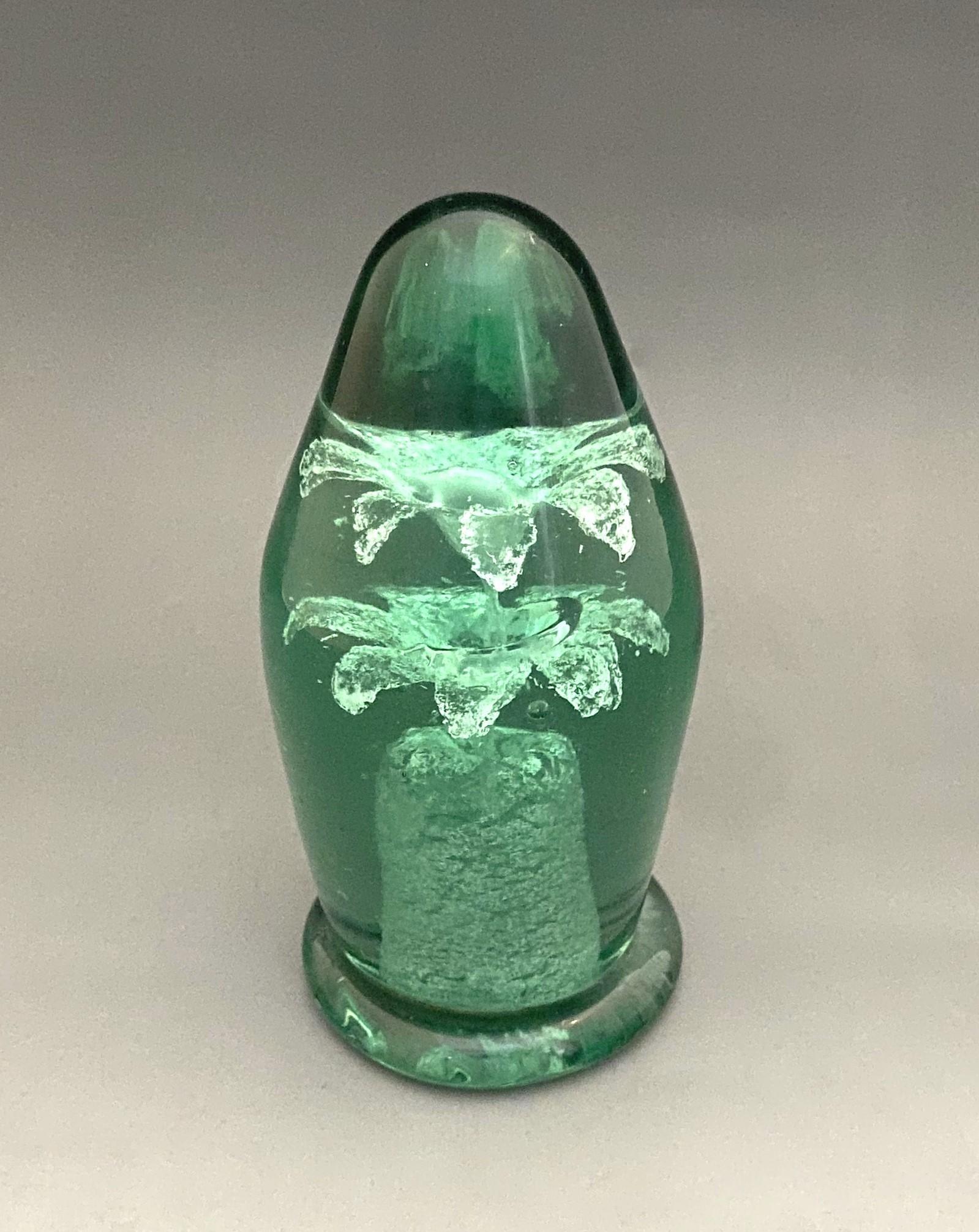 This is an unusual 19th Century Victorian antique glass dump or paperweight. This wonderful example is in bottle green glass and features beautiful, silvered double flowers in a vase. The dump is formed in the shape of a torpedo and stands on a applied, flattened base for stability, with a number of uses, this is an excellent and collectable example.