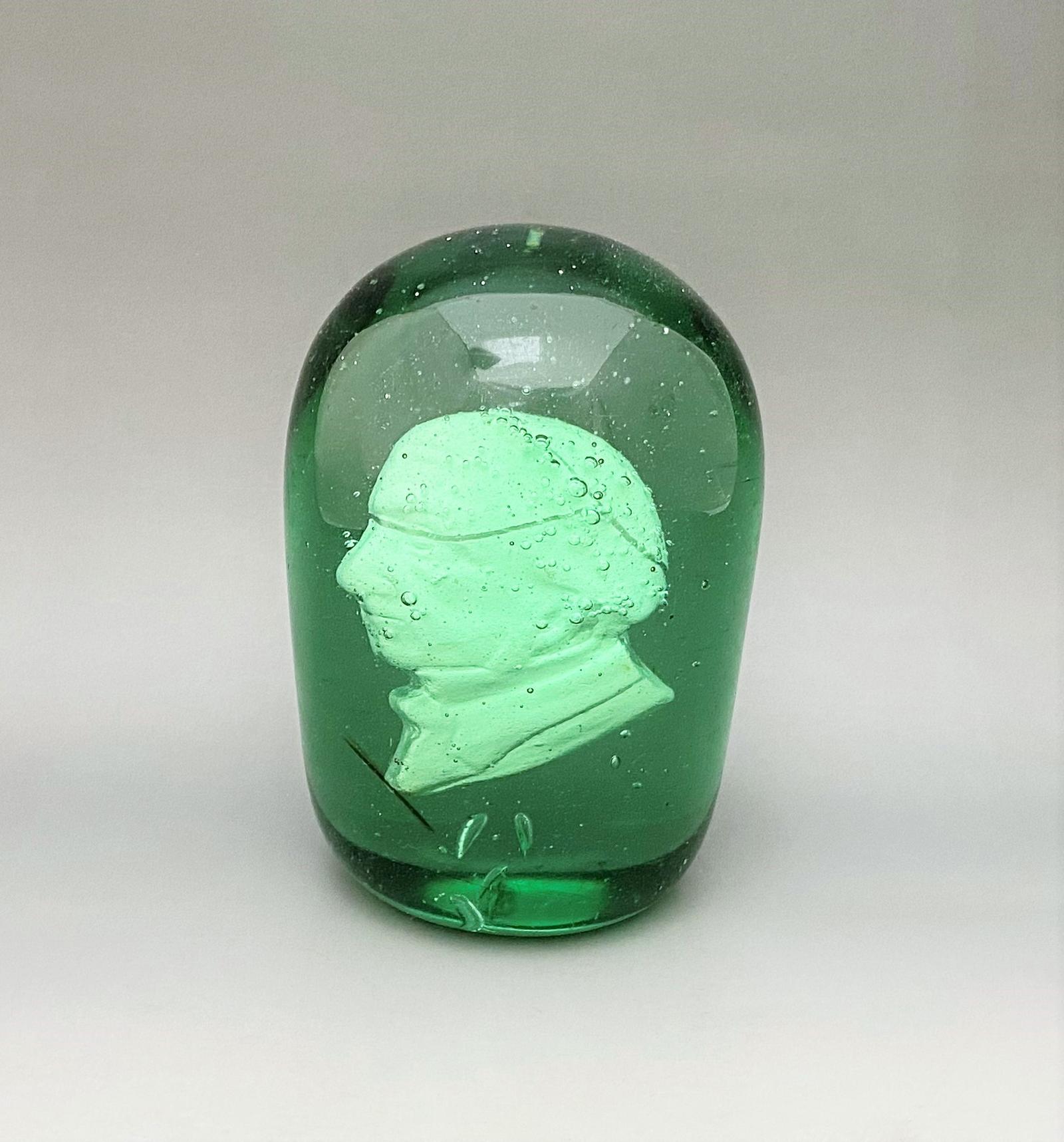 This is a rare mid 19th Century English Victorian antique glass dump or paperweight. This wonderful piece is in bottle green glass and features a sulphide of a Gentleman's Cameo. The body is ovoid with a flattened base for stability, with a number of uses, this is an attractive and collectable example.