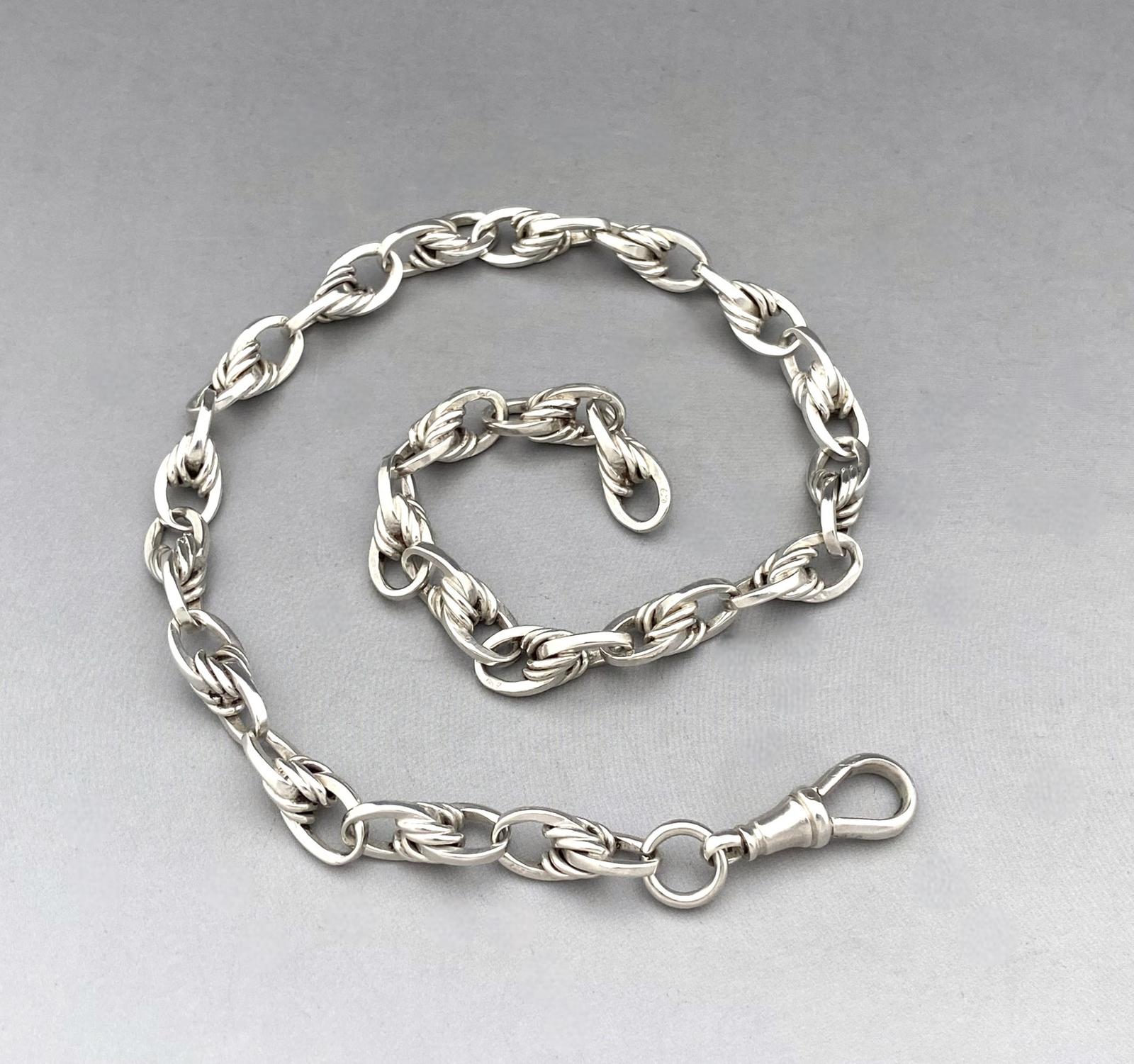 A useful silver albert chain, dating to the Edwardian era. This unusual example is of good weight silver and each link is marked with the Sterling lion. There is a fastening clip to one end and the links are of an attractive double loop design, which are fixed by entwined wirework.